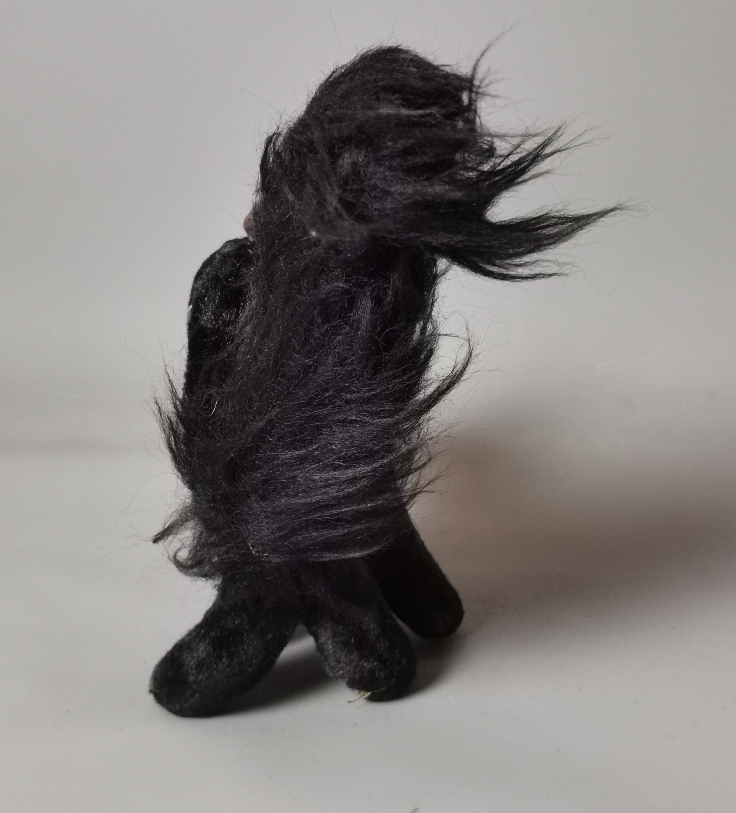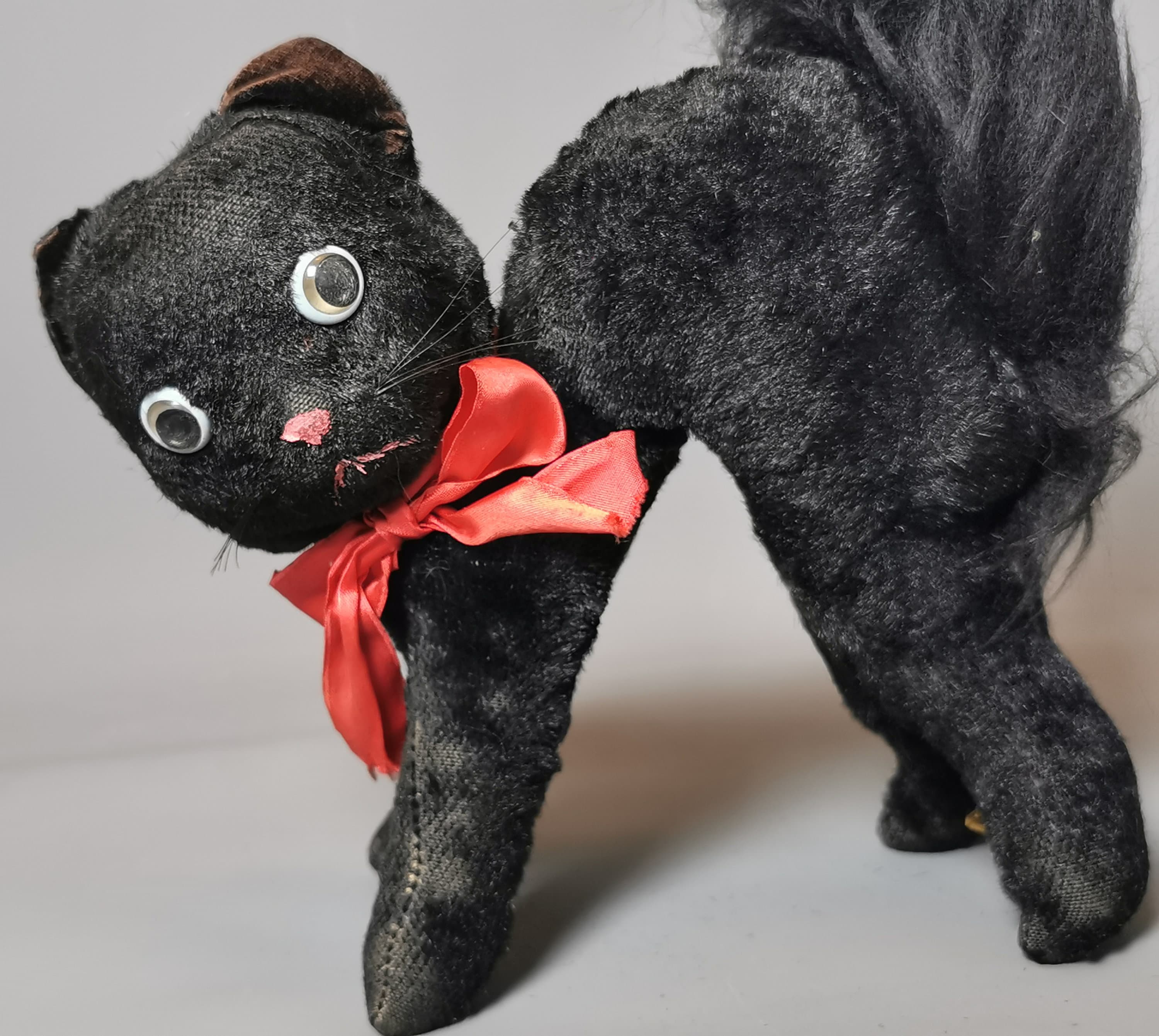 Black mohair with velvet pads and long fluffy black tail, he has large celluloid eyes and a stitched nose and mouth.