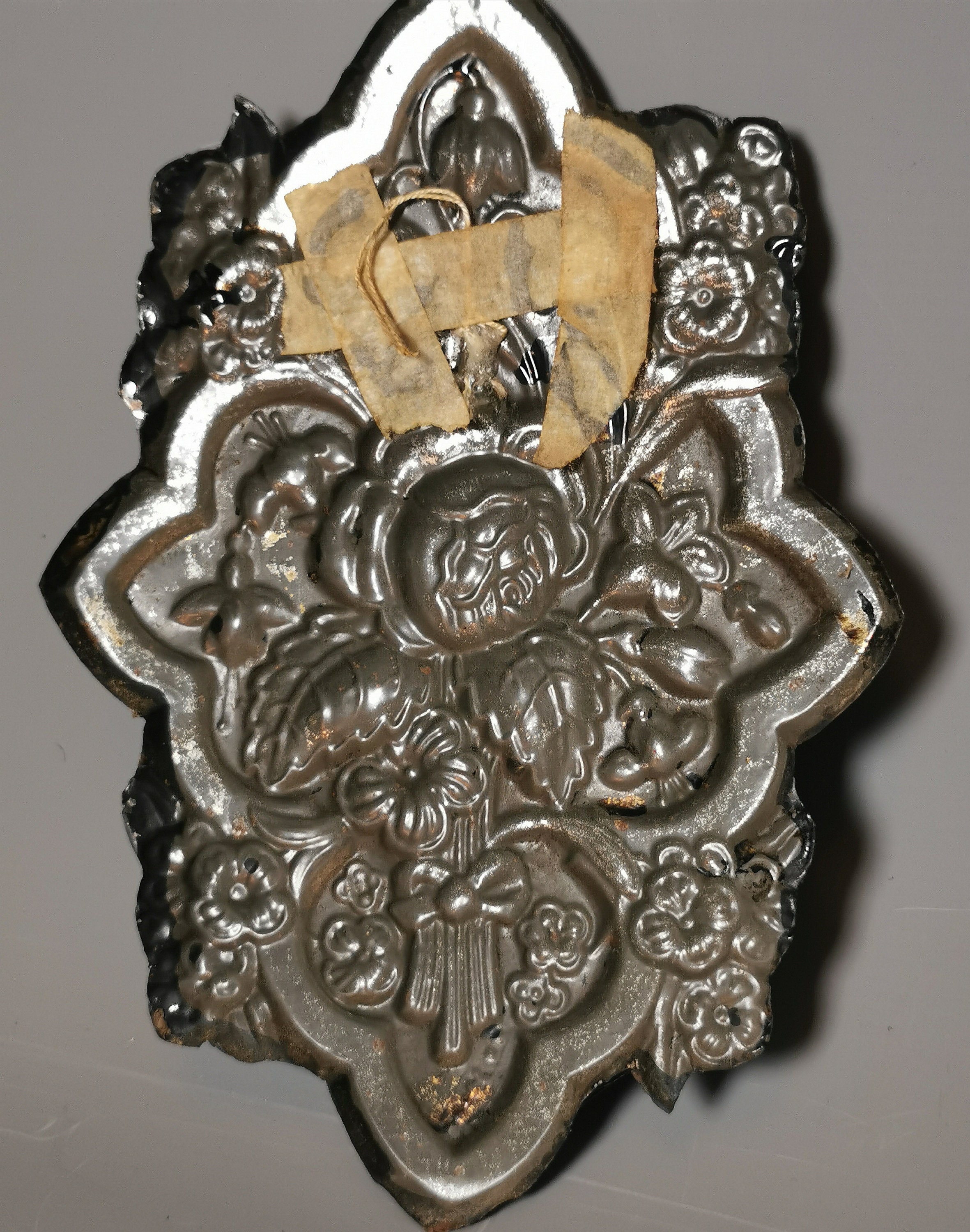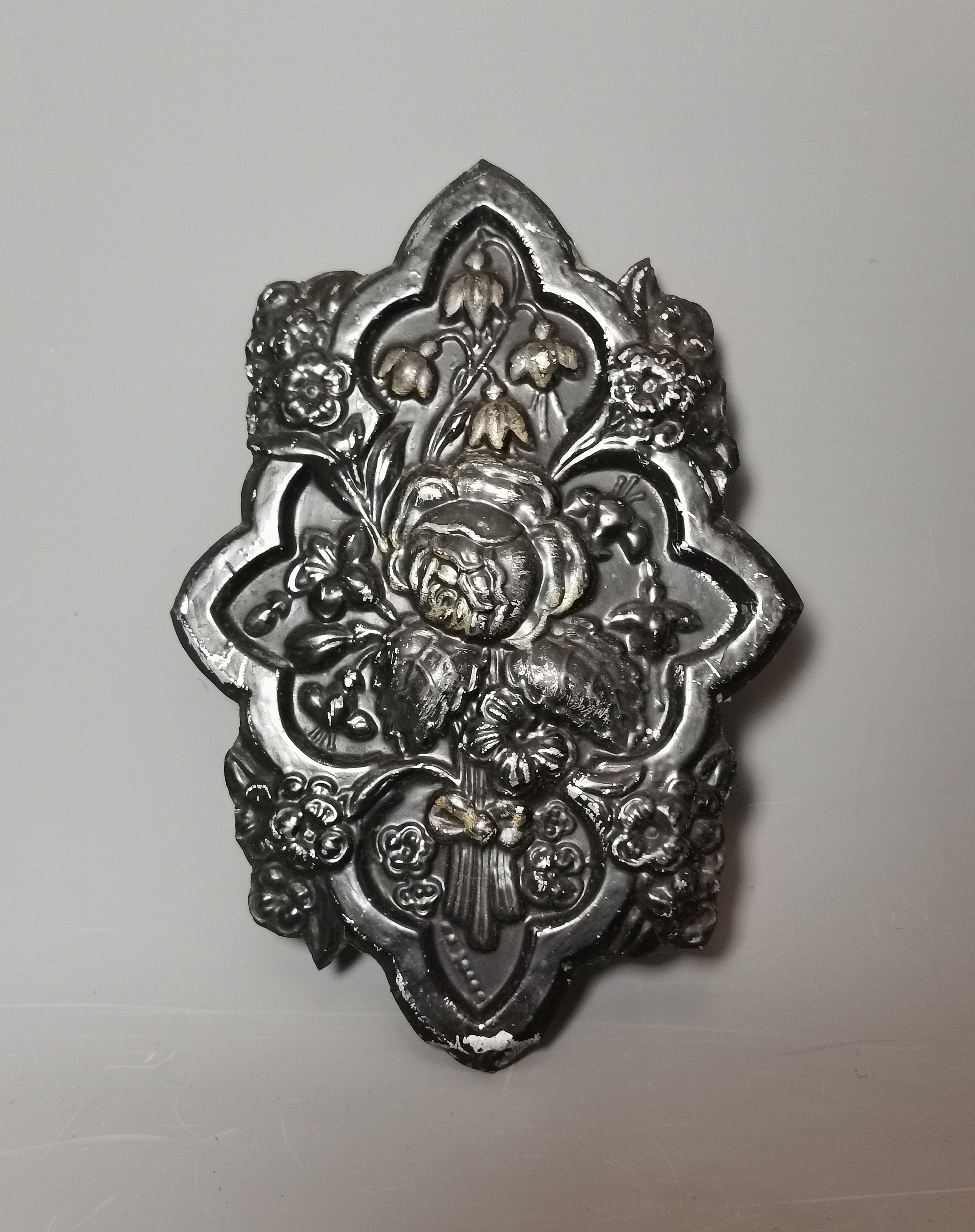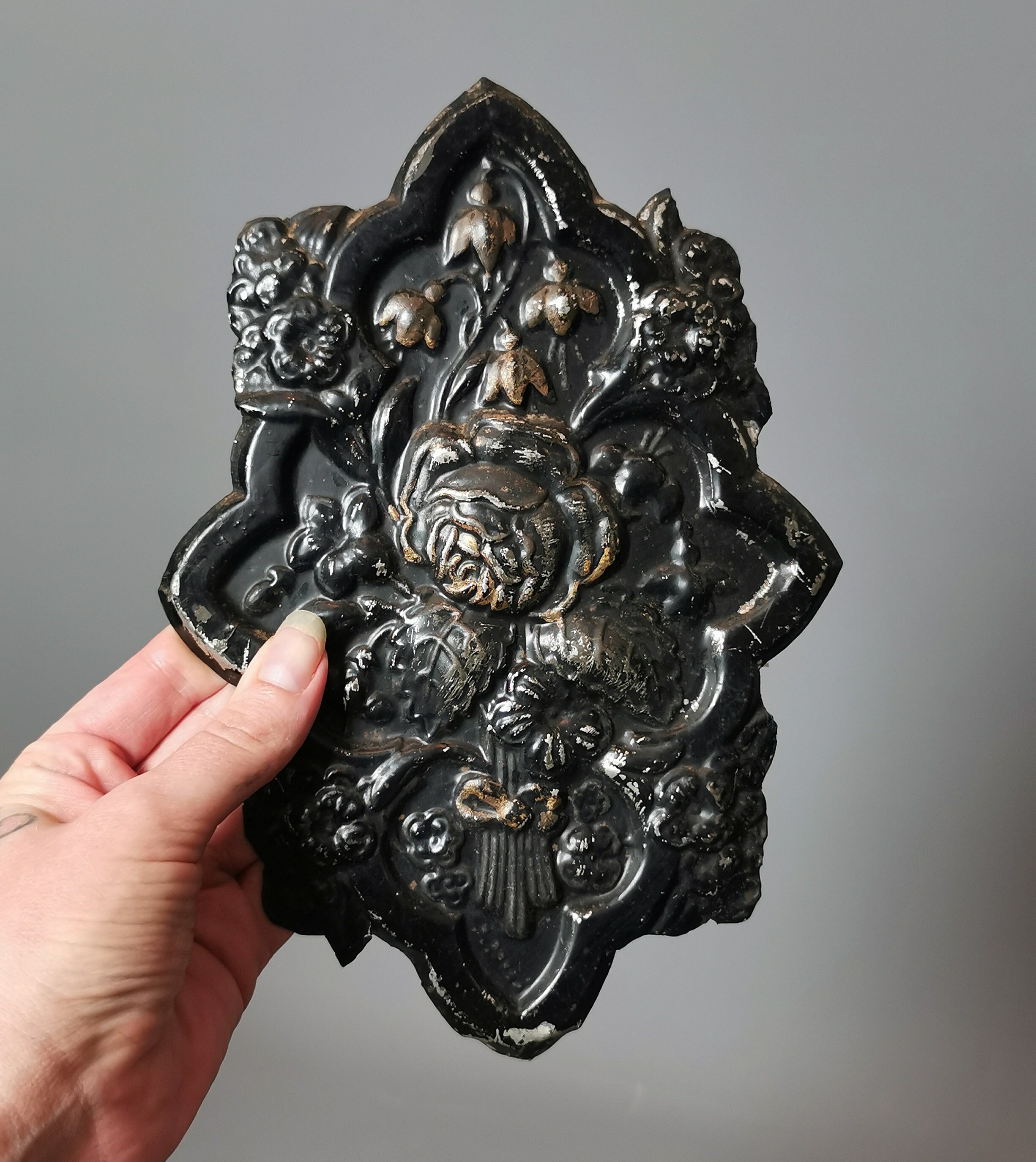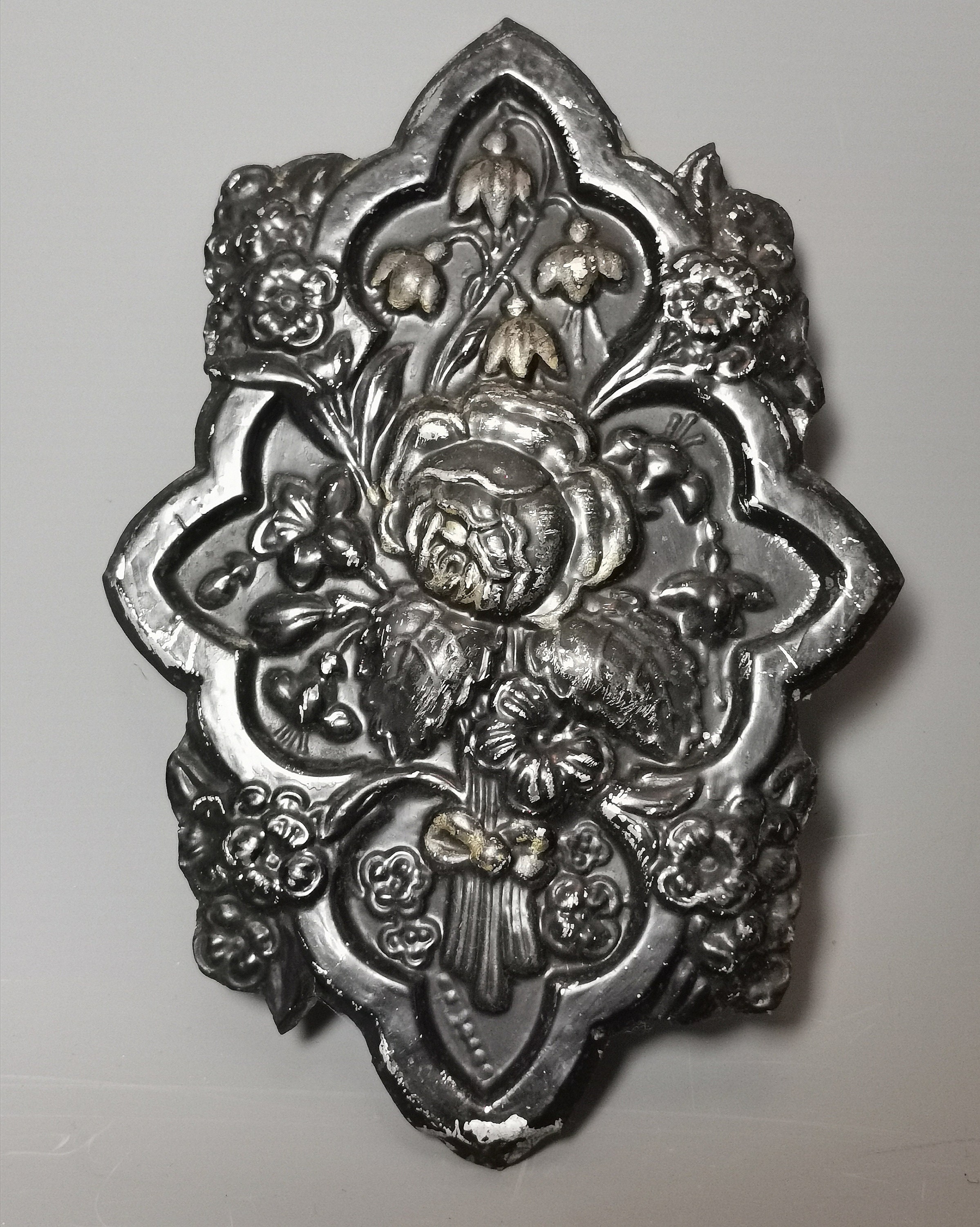 It is made from pressed and moulded tin with a repousse design which has been finished in a black japanned enamel.