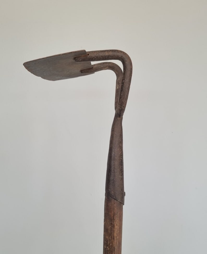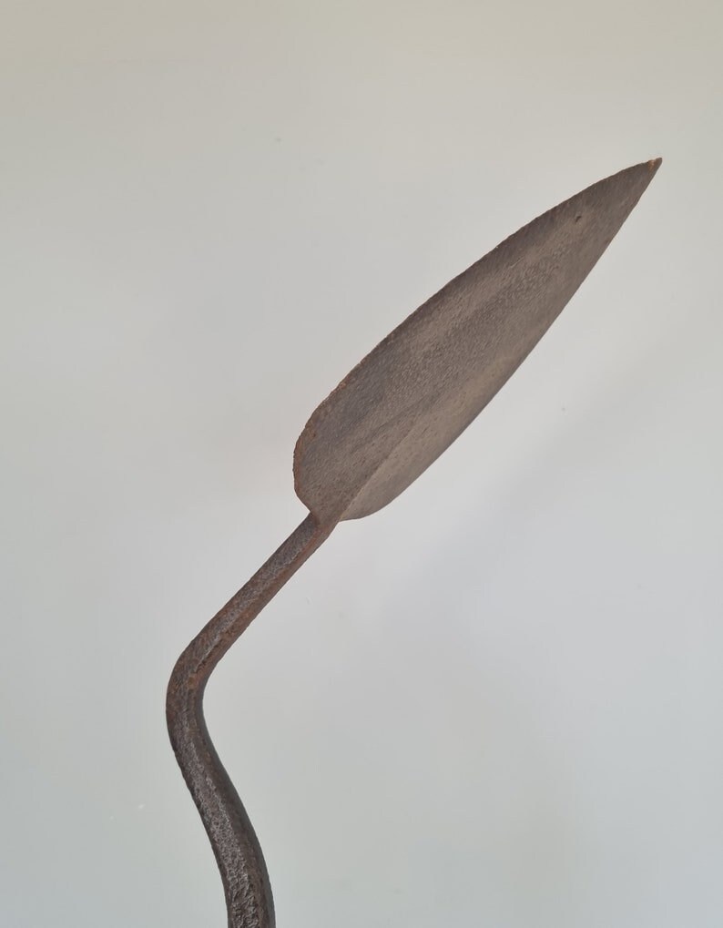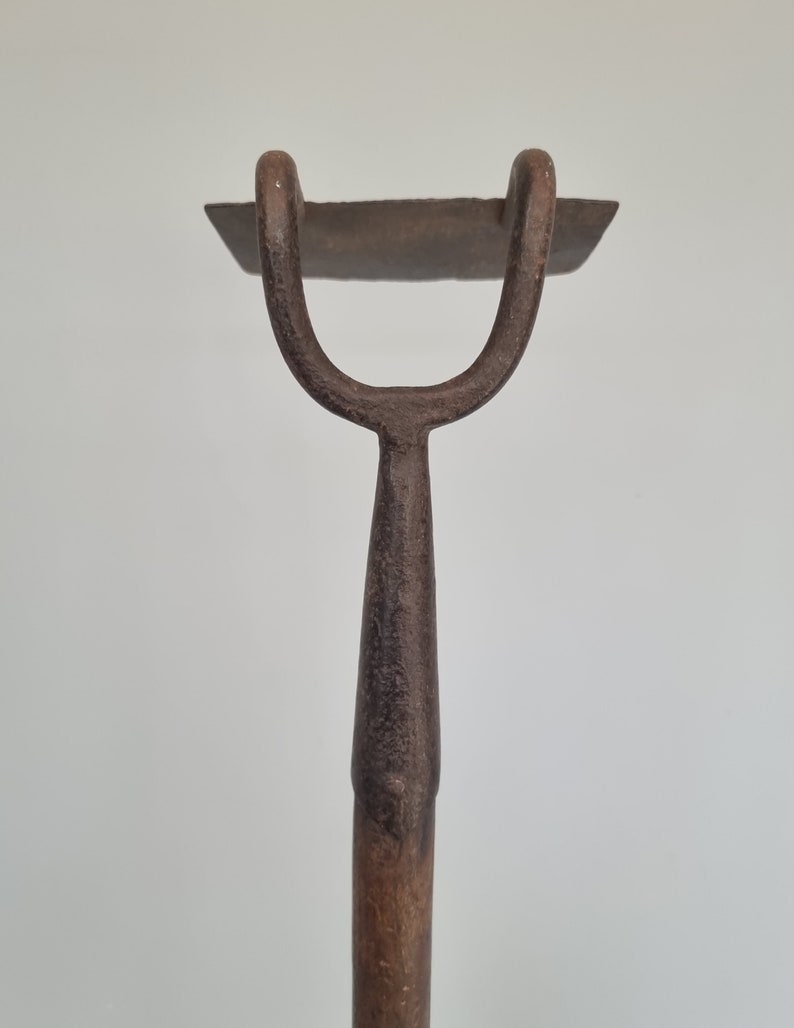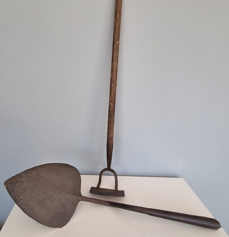 The set comprises of a shovel and a hoe, the shovel or spade having a very large flat point head made from solid hammered antique iron with a very long neck, the hoe is also made from Iron.