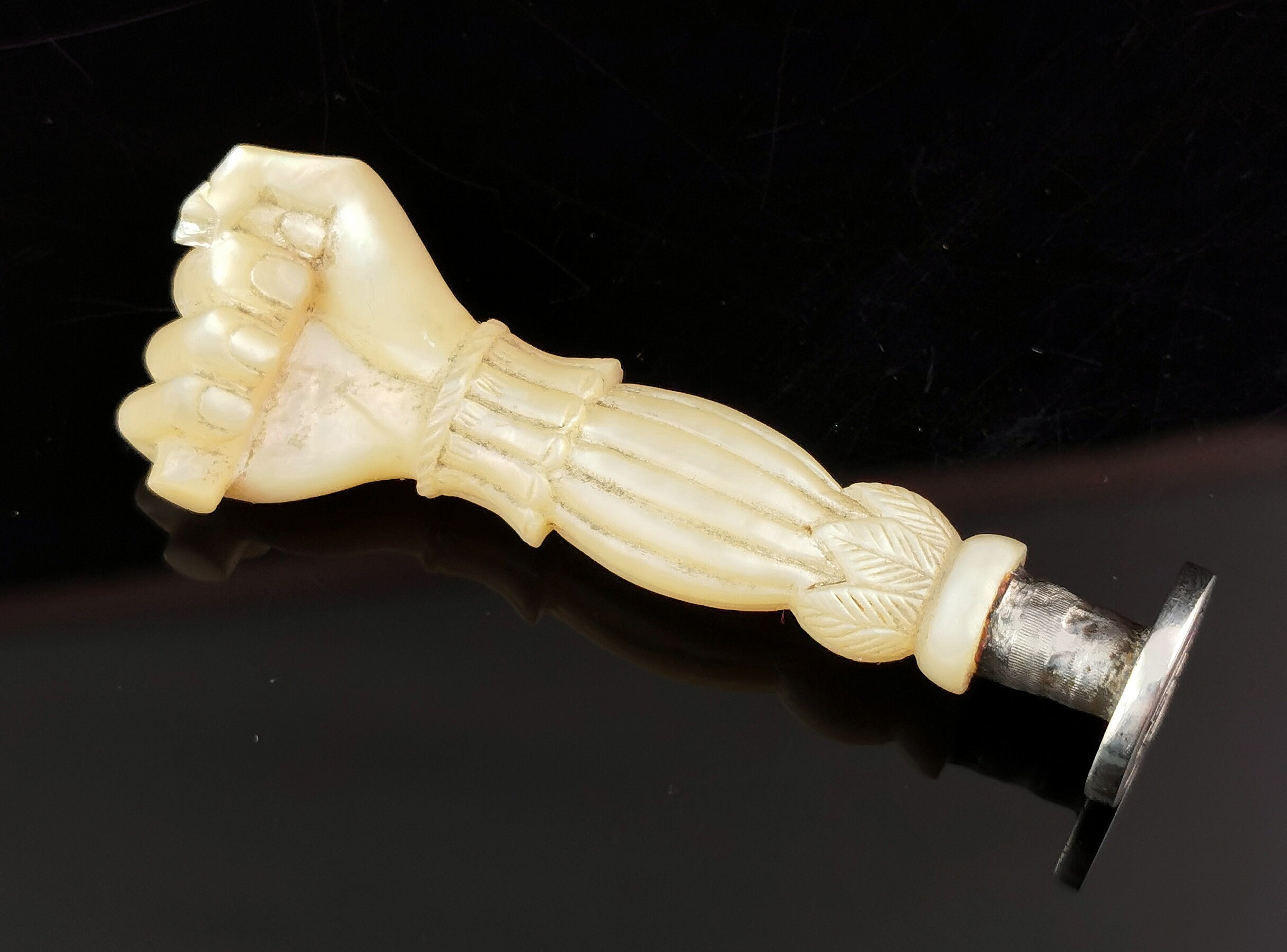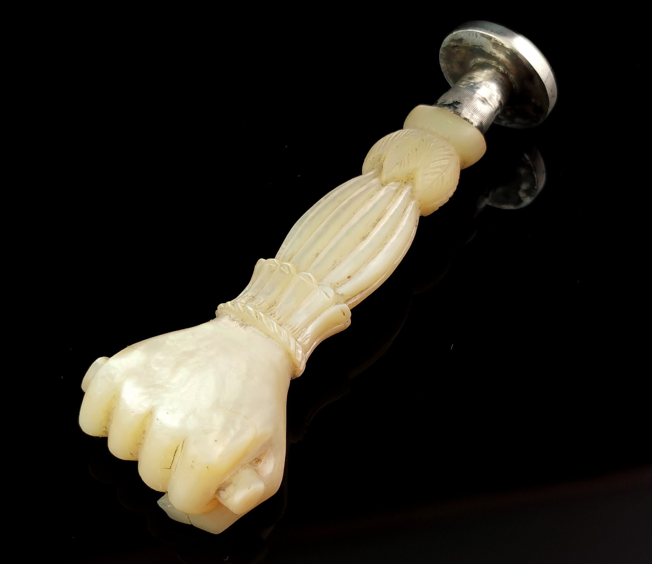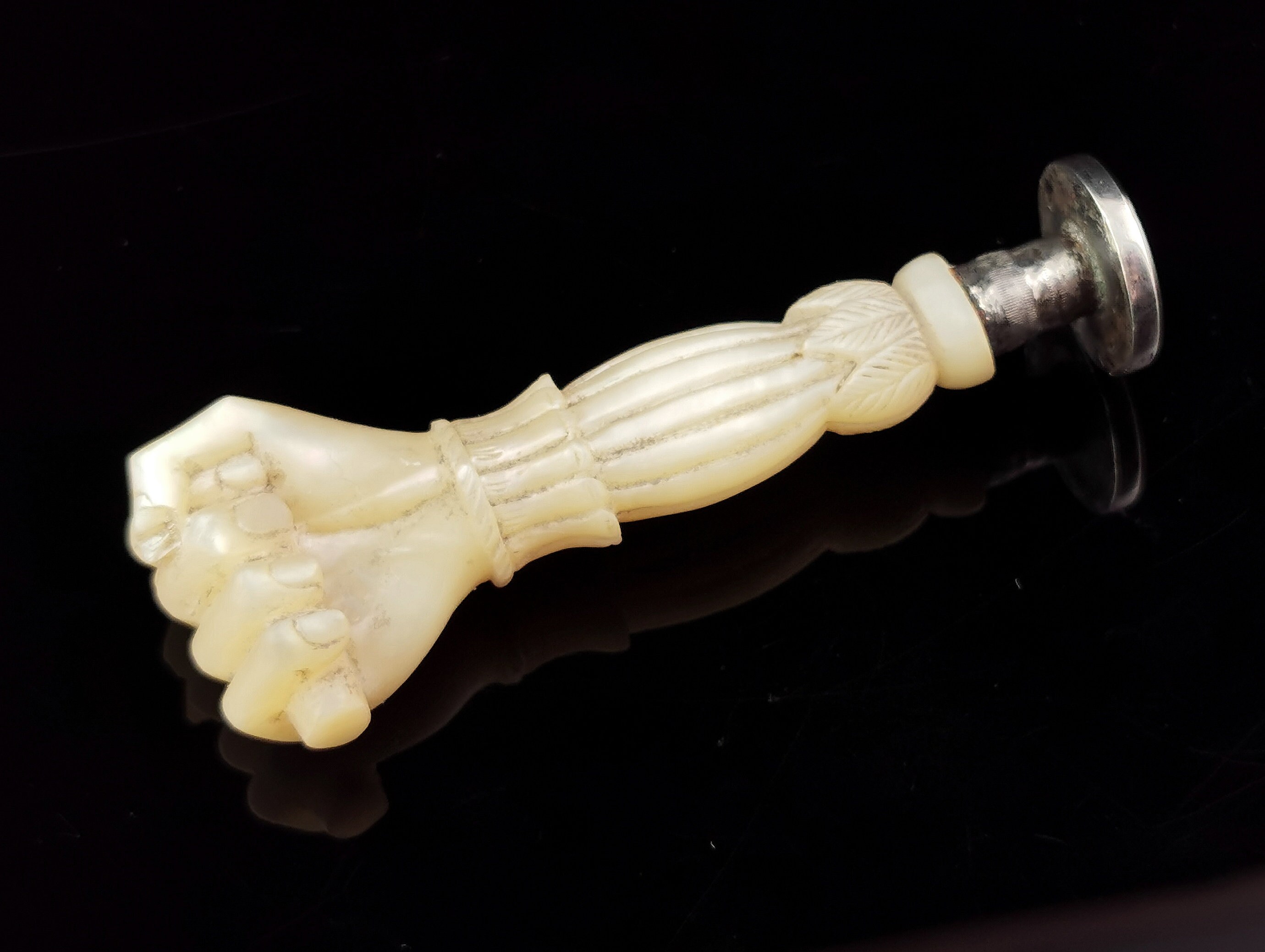 It is designed as a clenched hand or fist with a decorative sleeve, beautifully carved from mother of pearl it has a white metal base and a silver matrix, testing as low grade silver.
