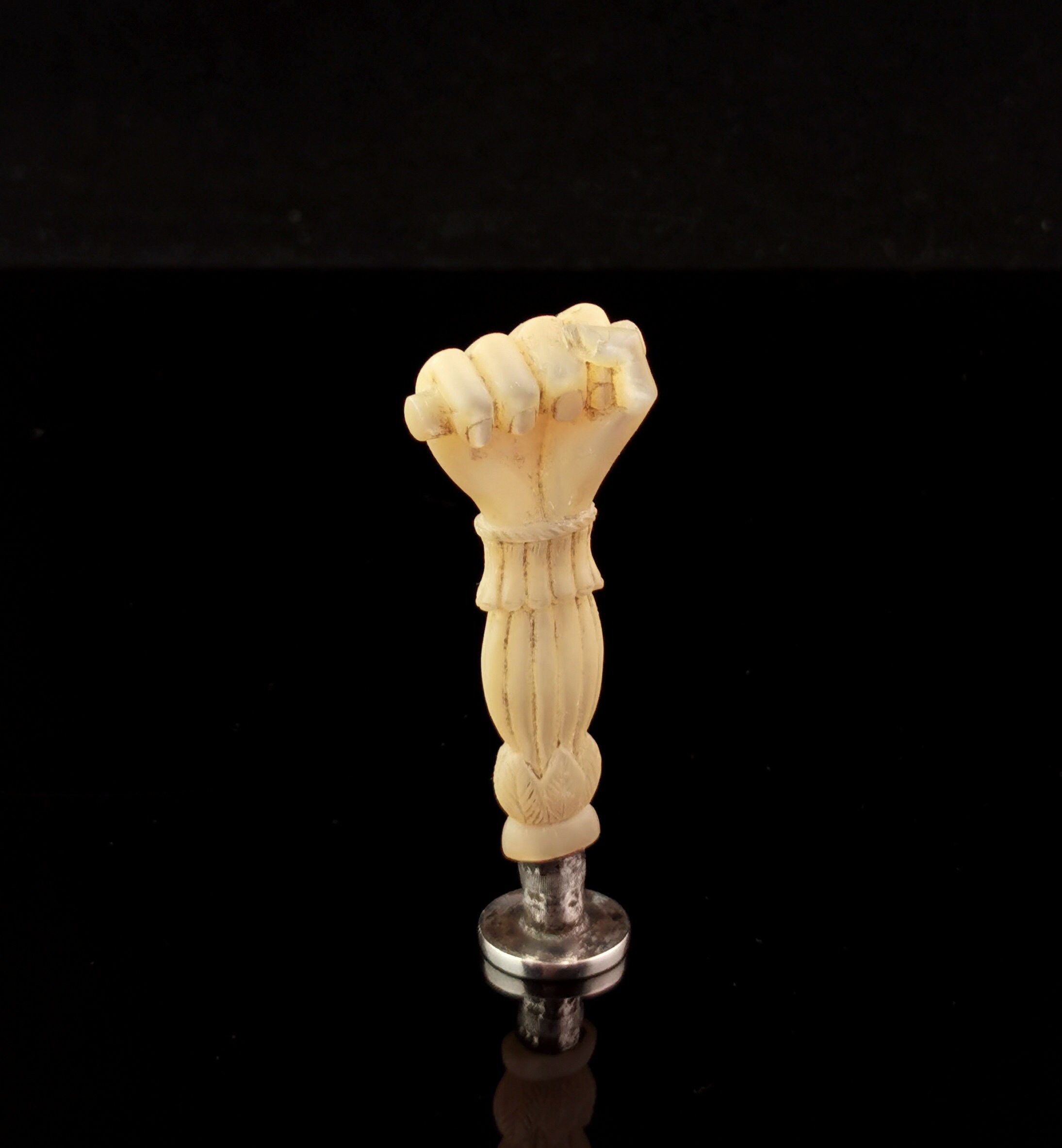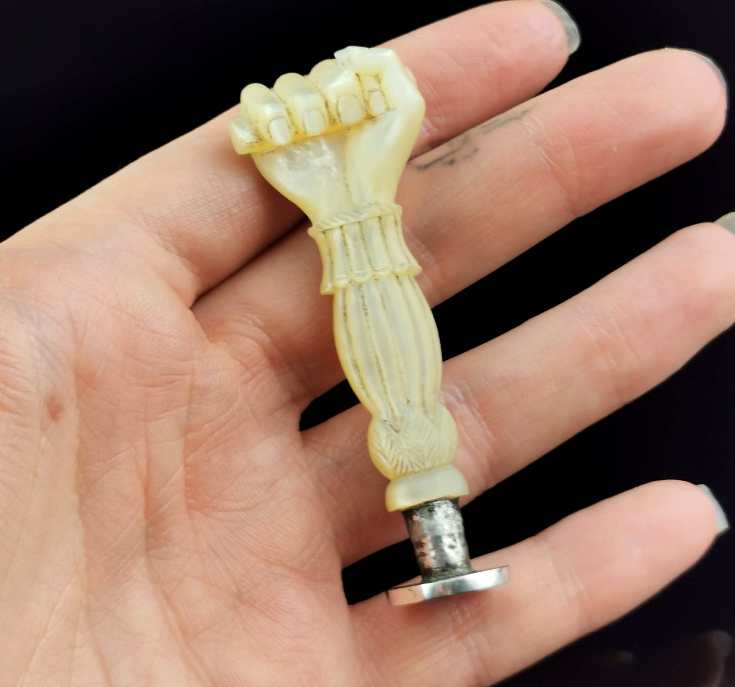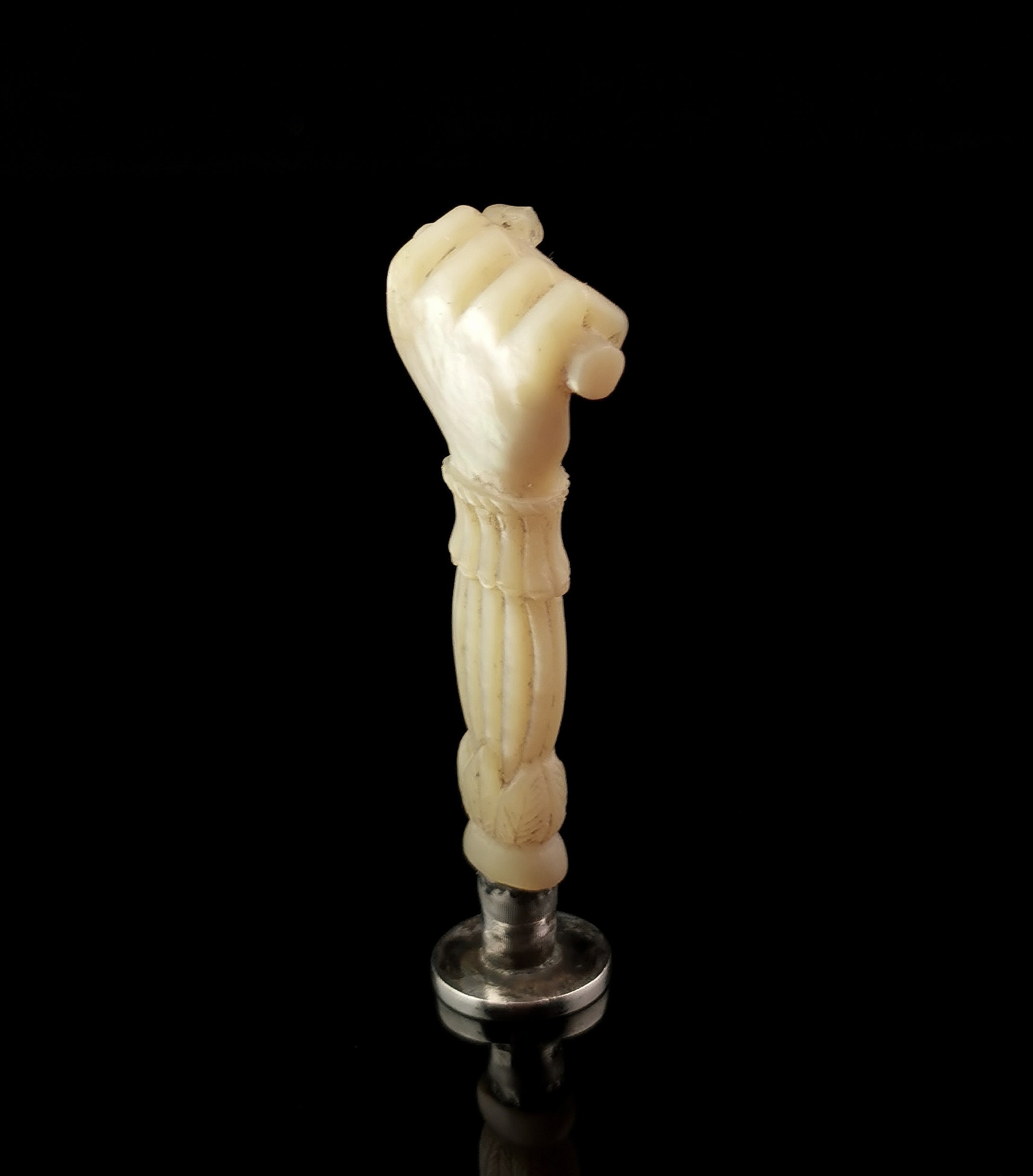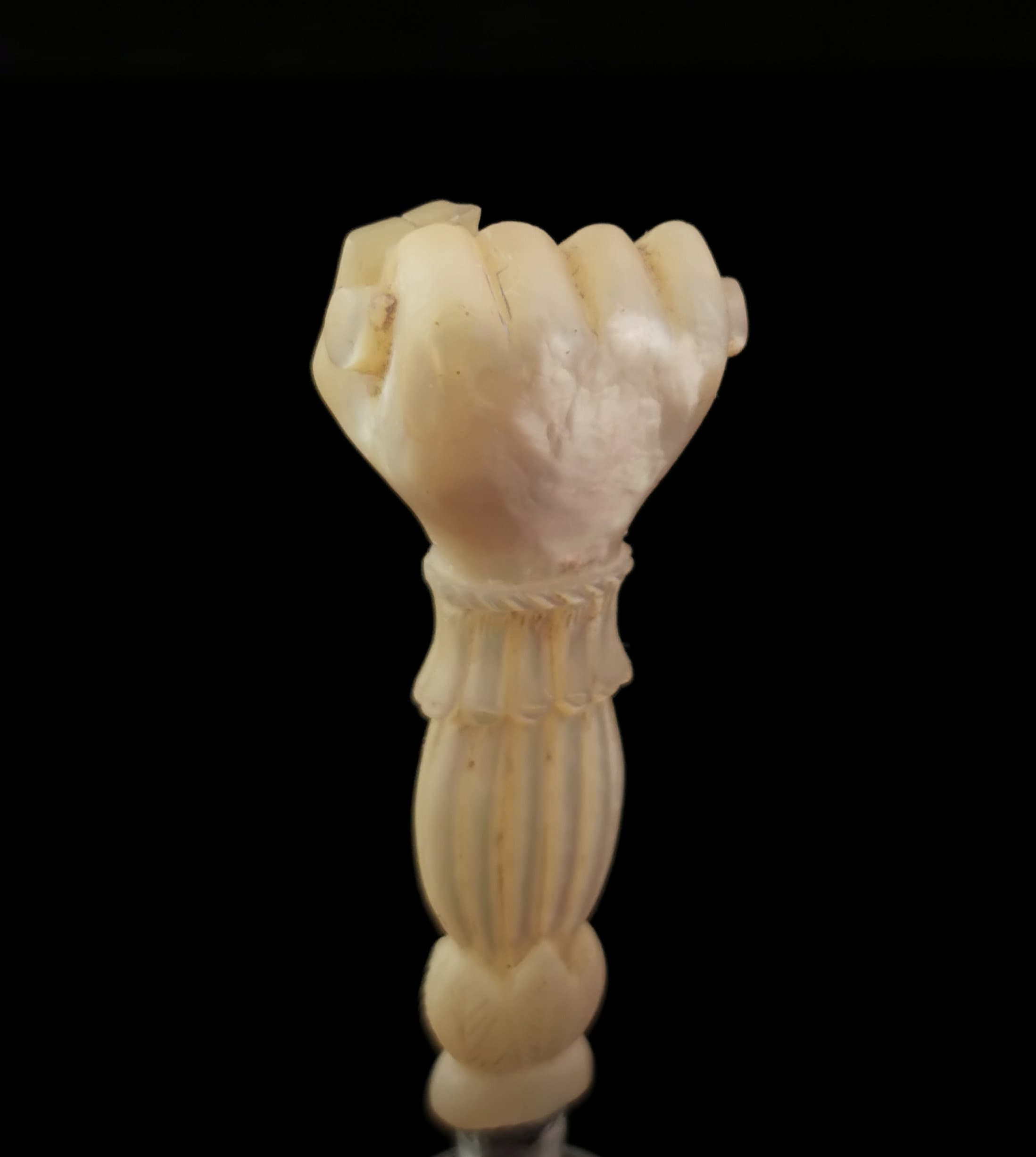 It is designed as a clenched hand or fist with a decorative sleeve, beautifully carved from mother of pearl it has a white metal base and a silver matrix, testing as low grade silver.