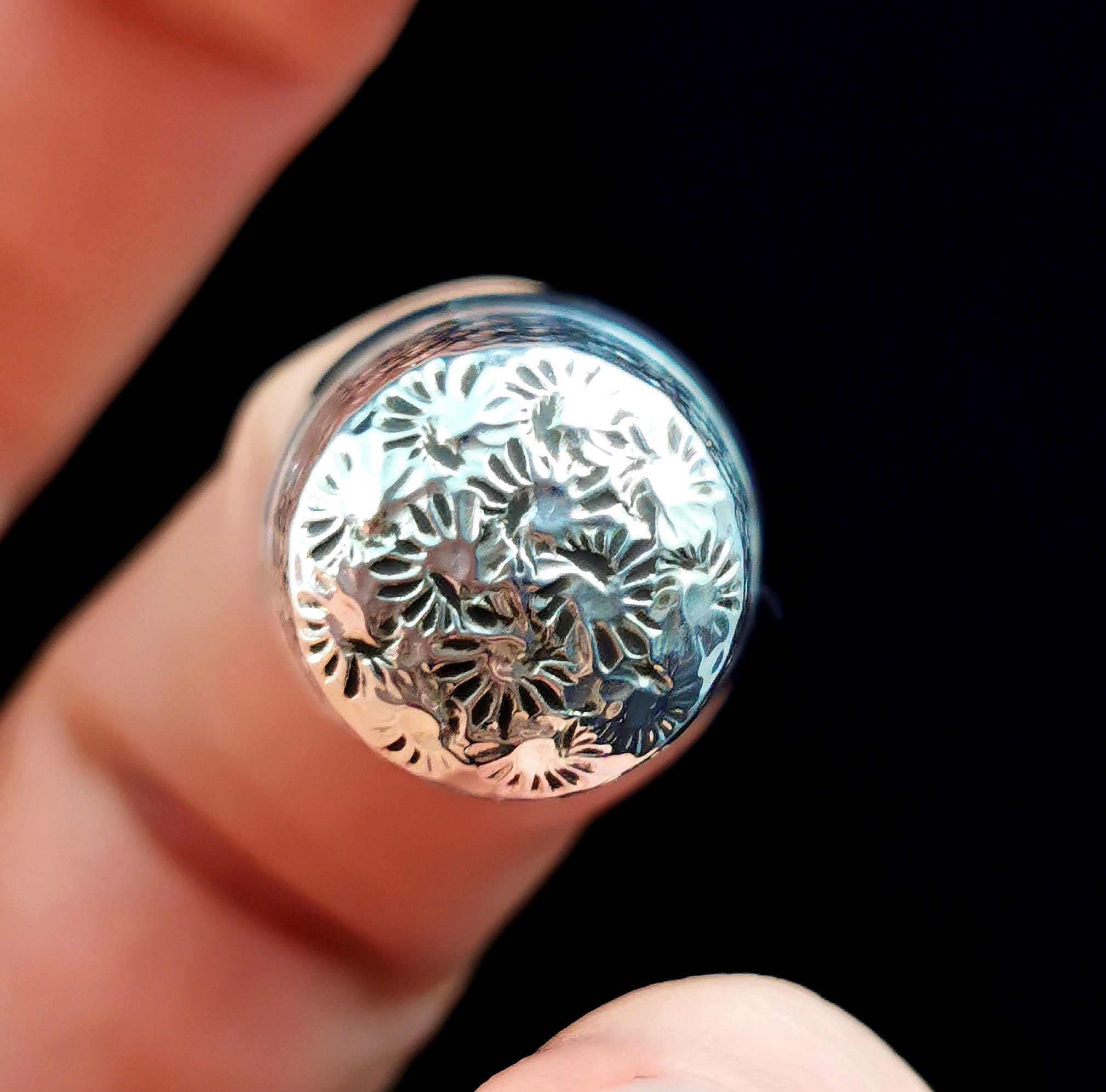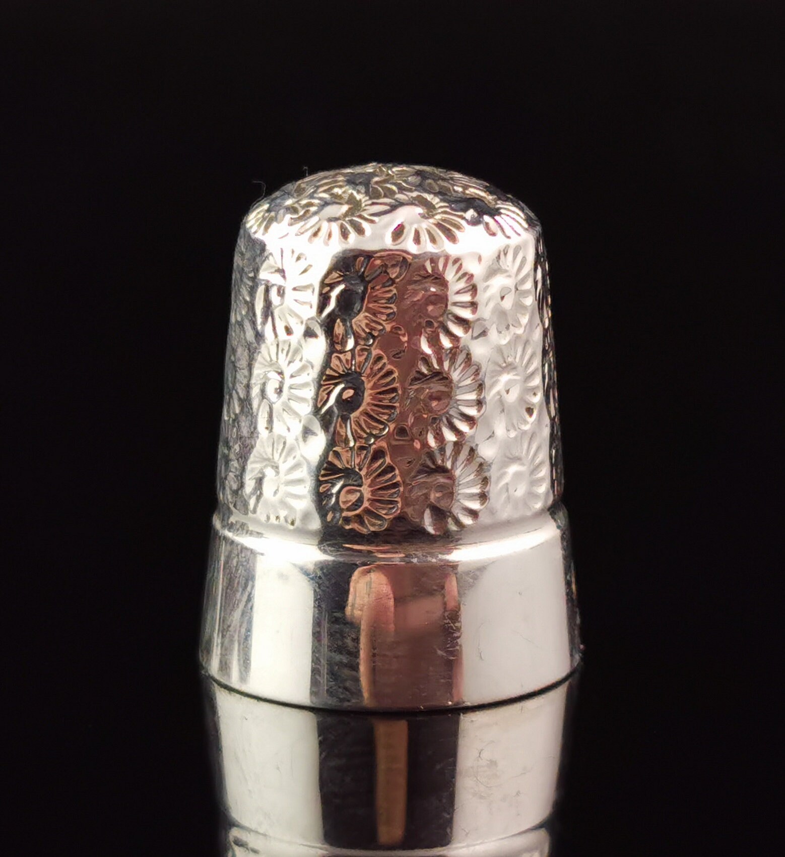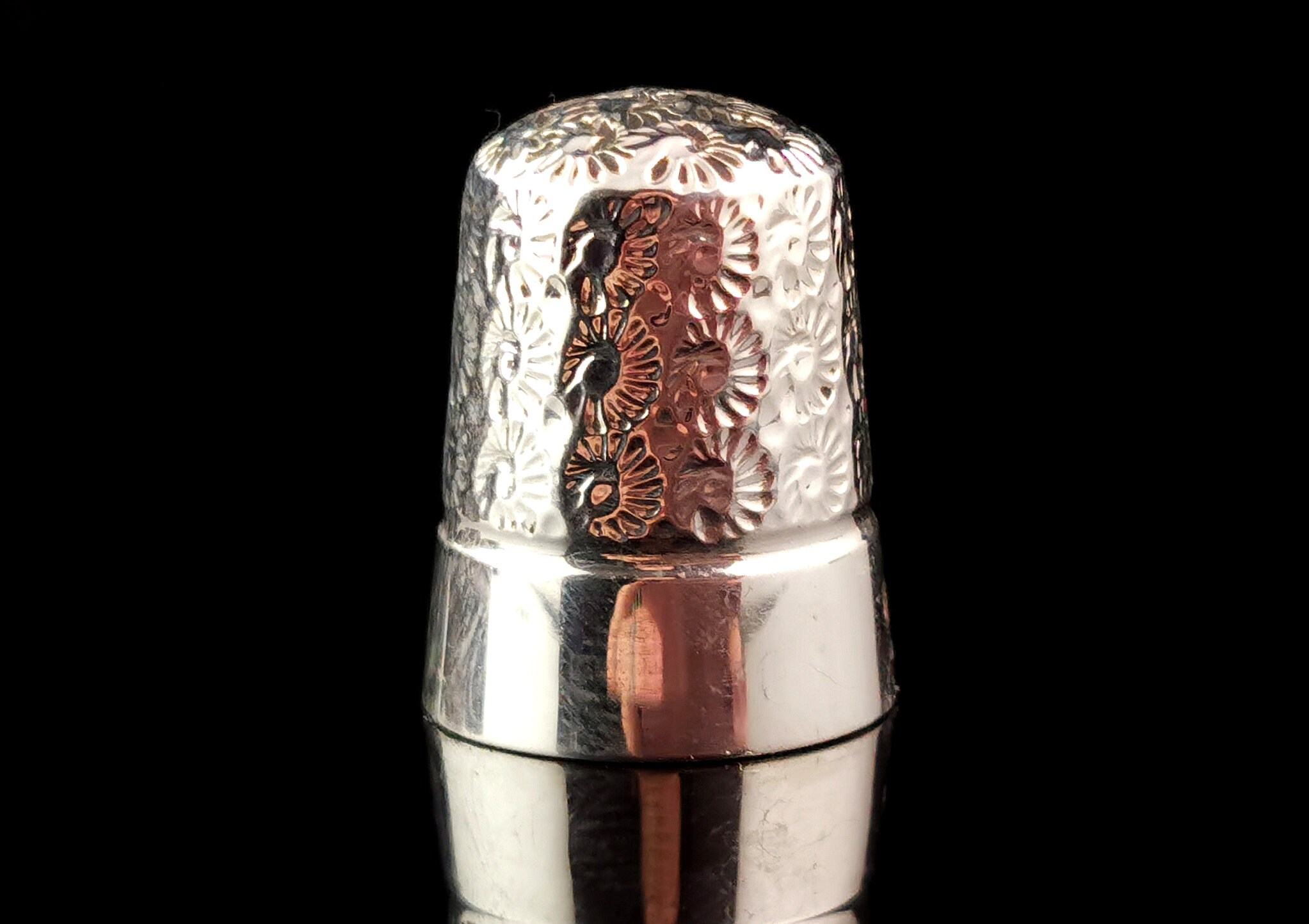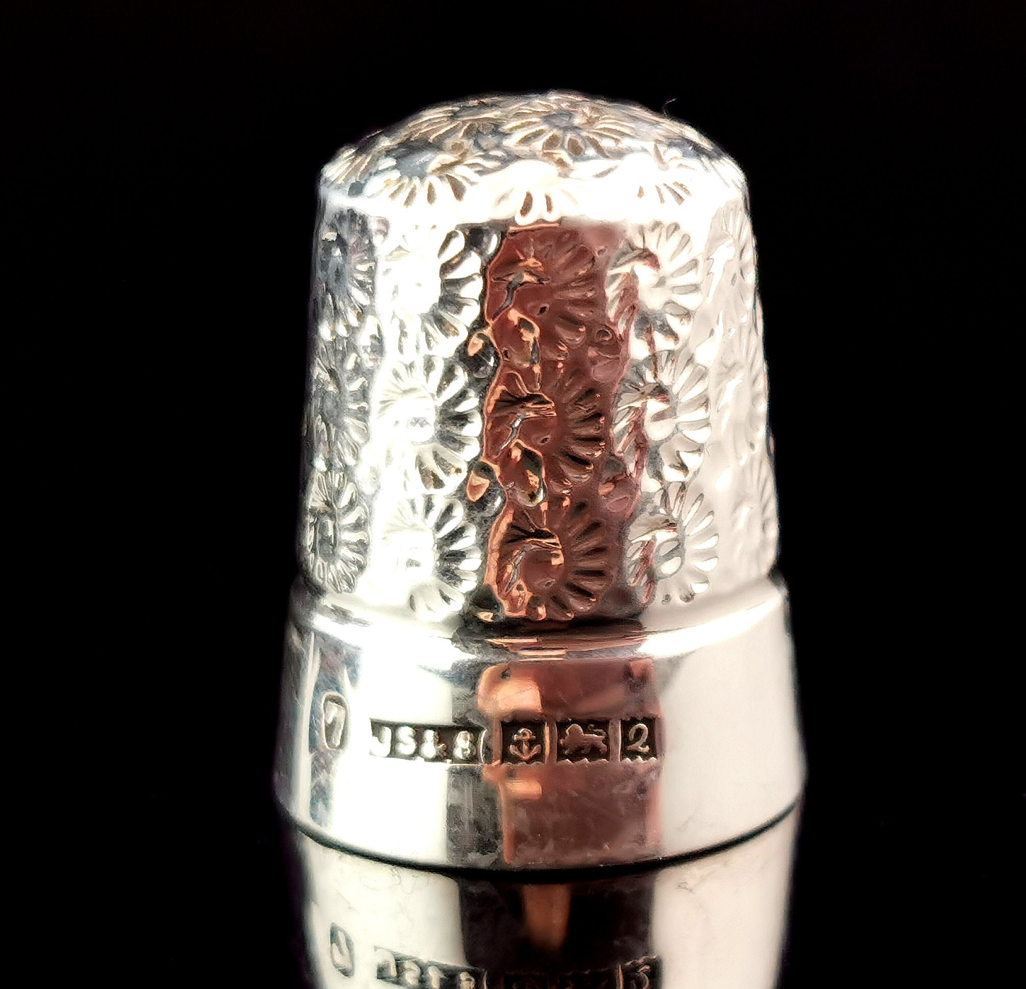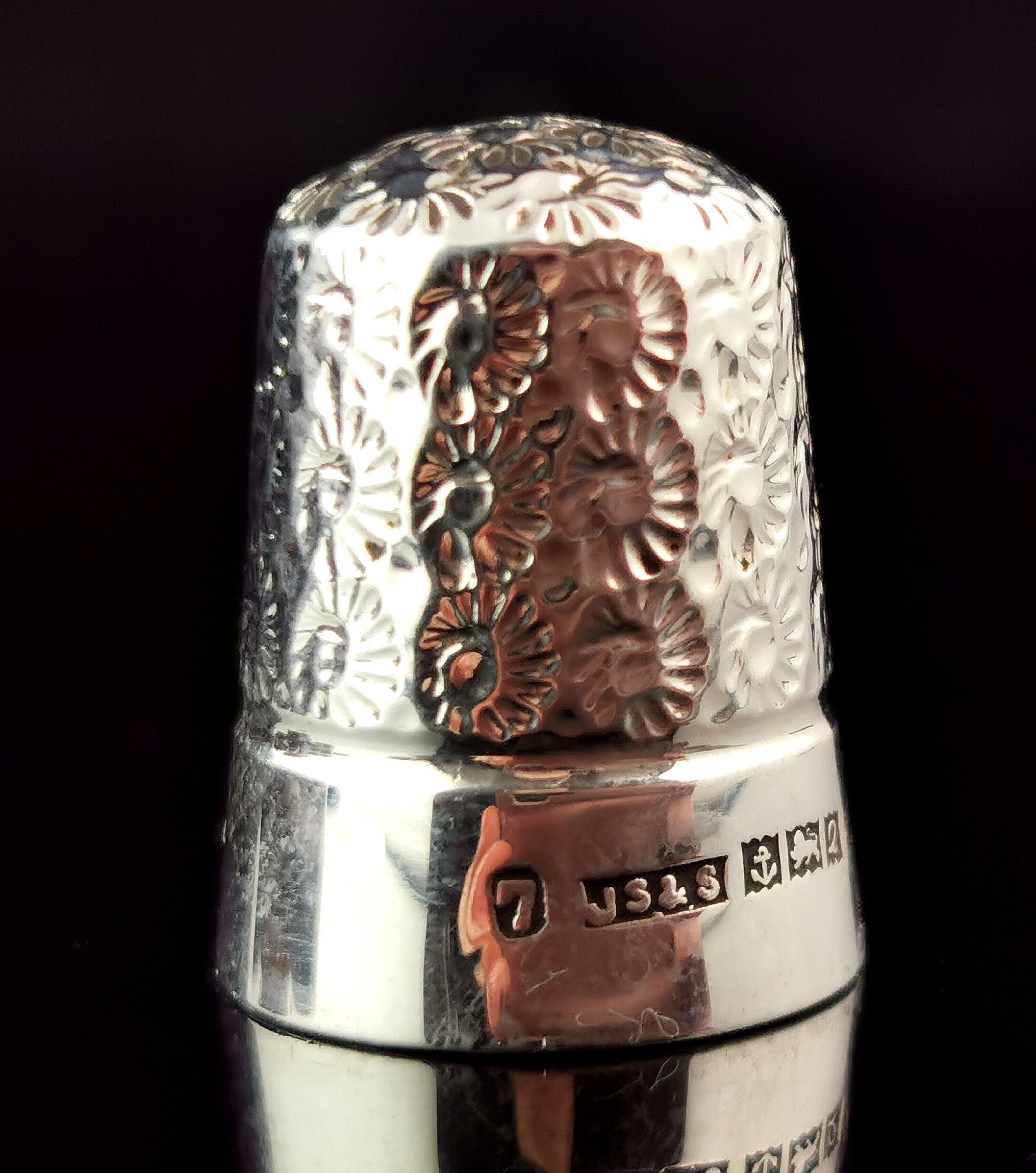 The thimble is fully hallmarked for sterling silver, Birmingham assay office, 1965.