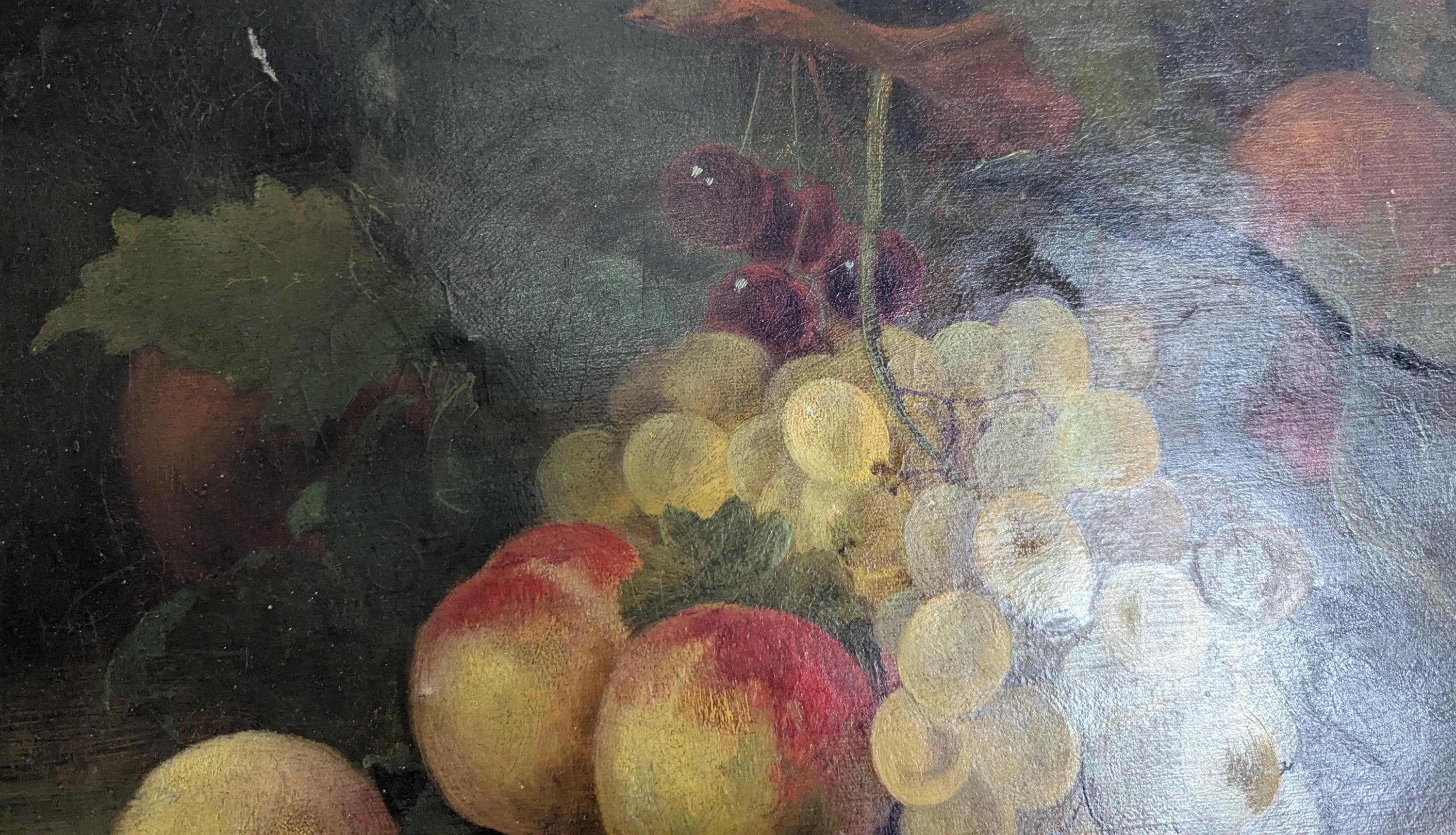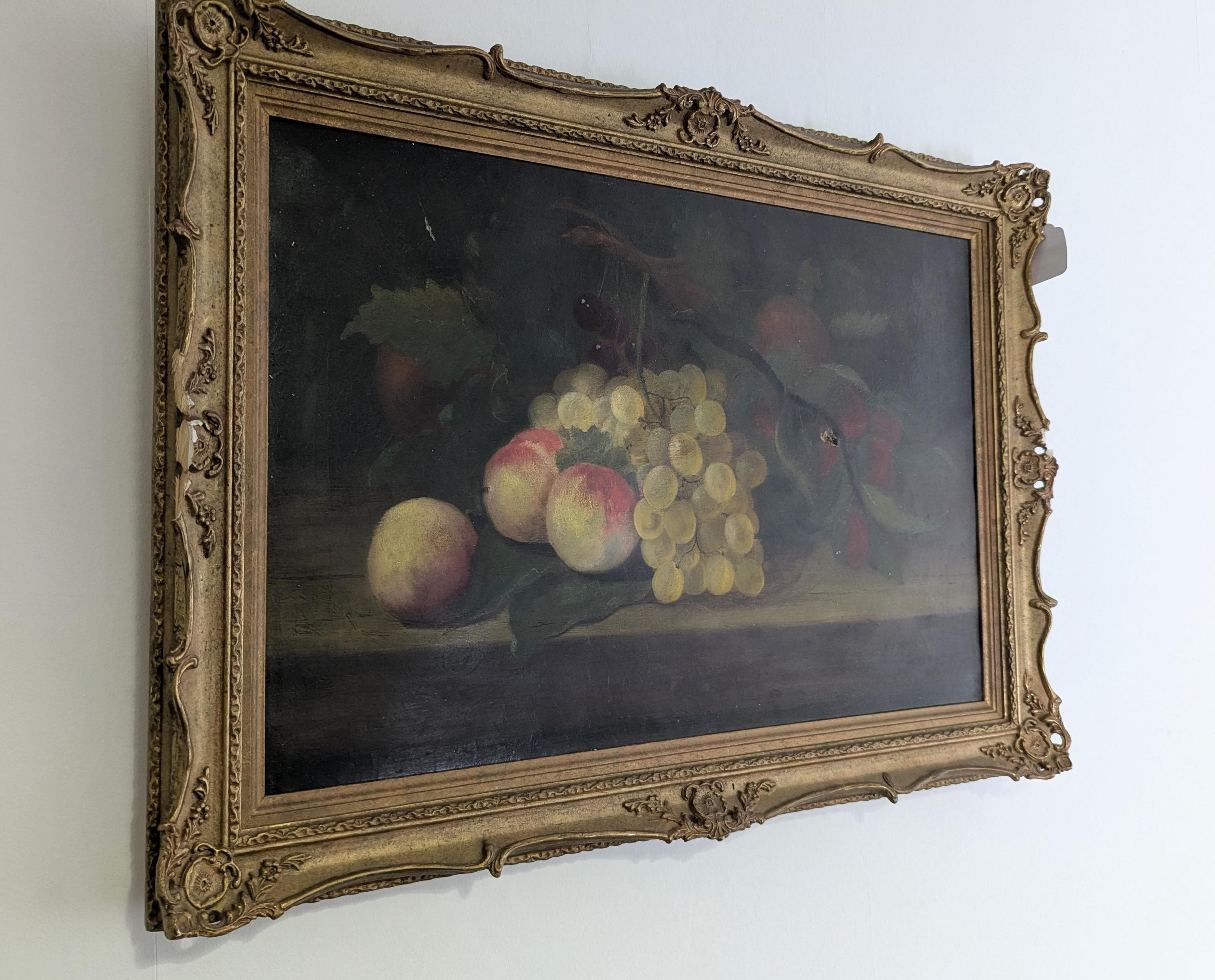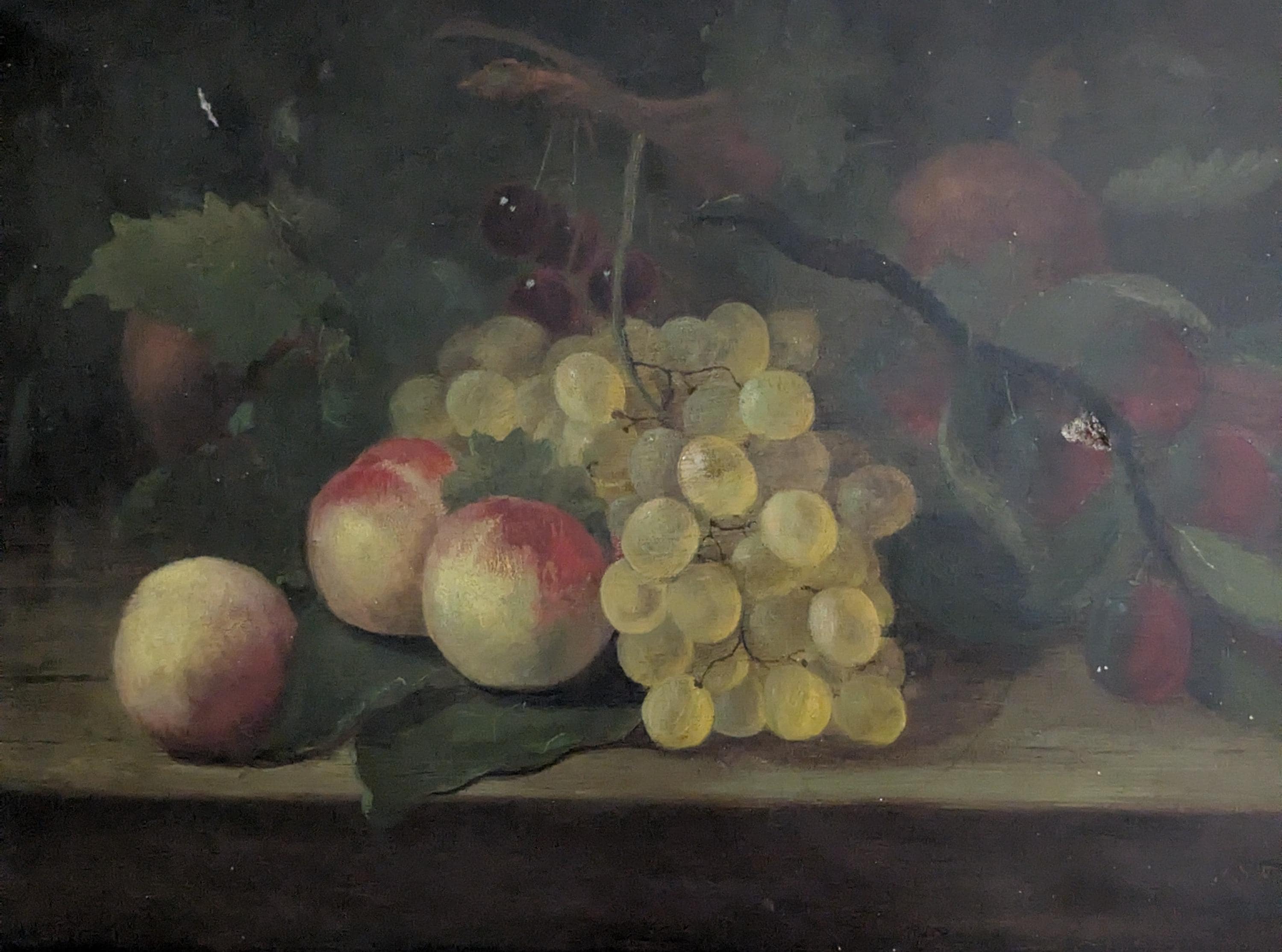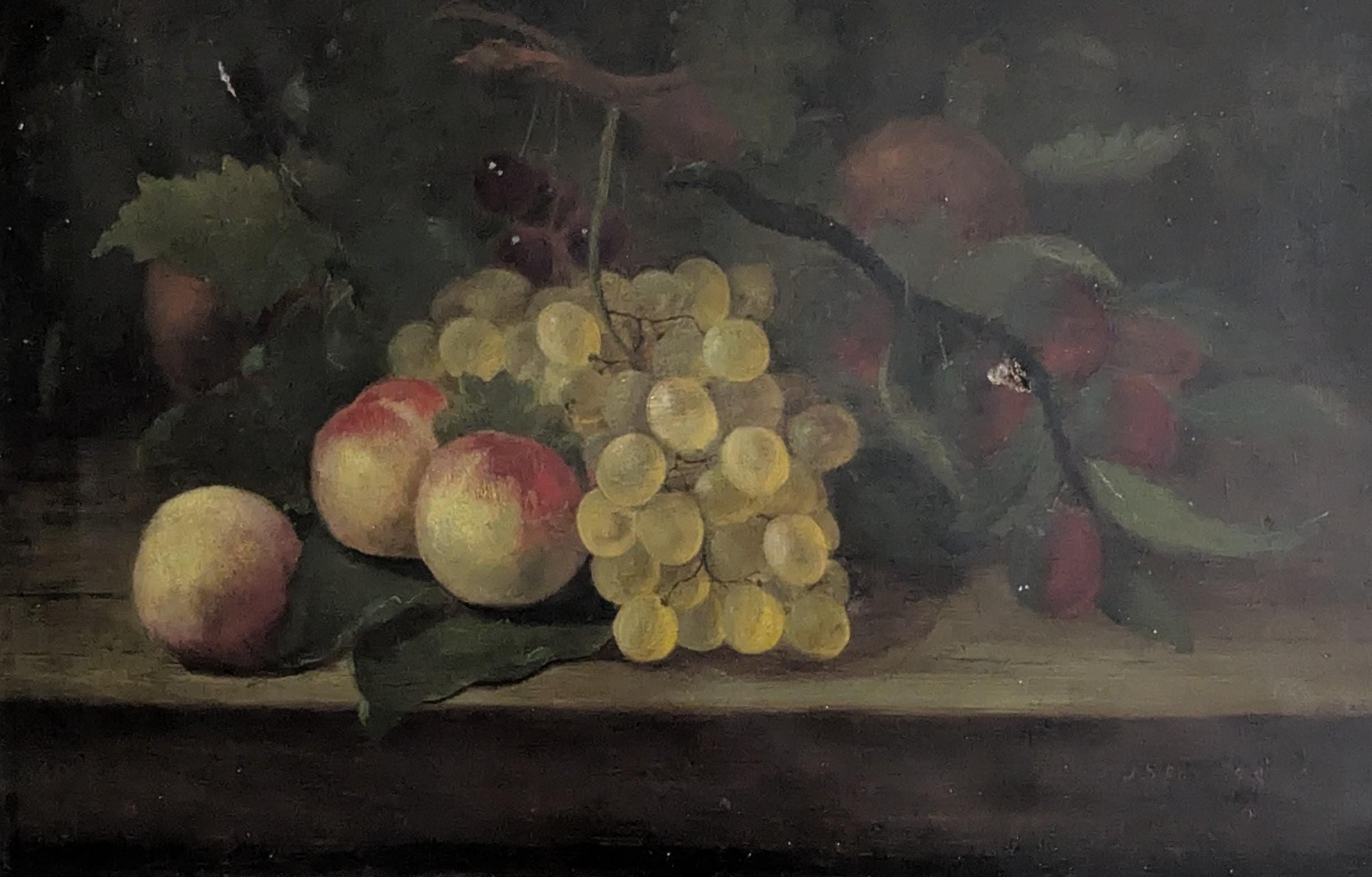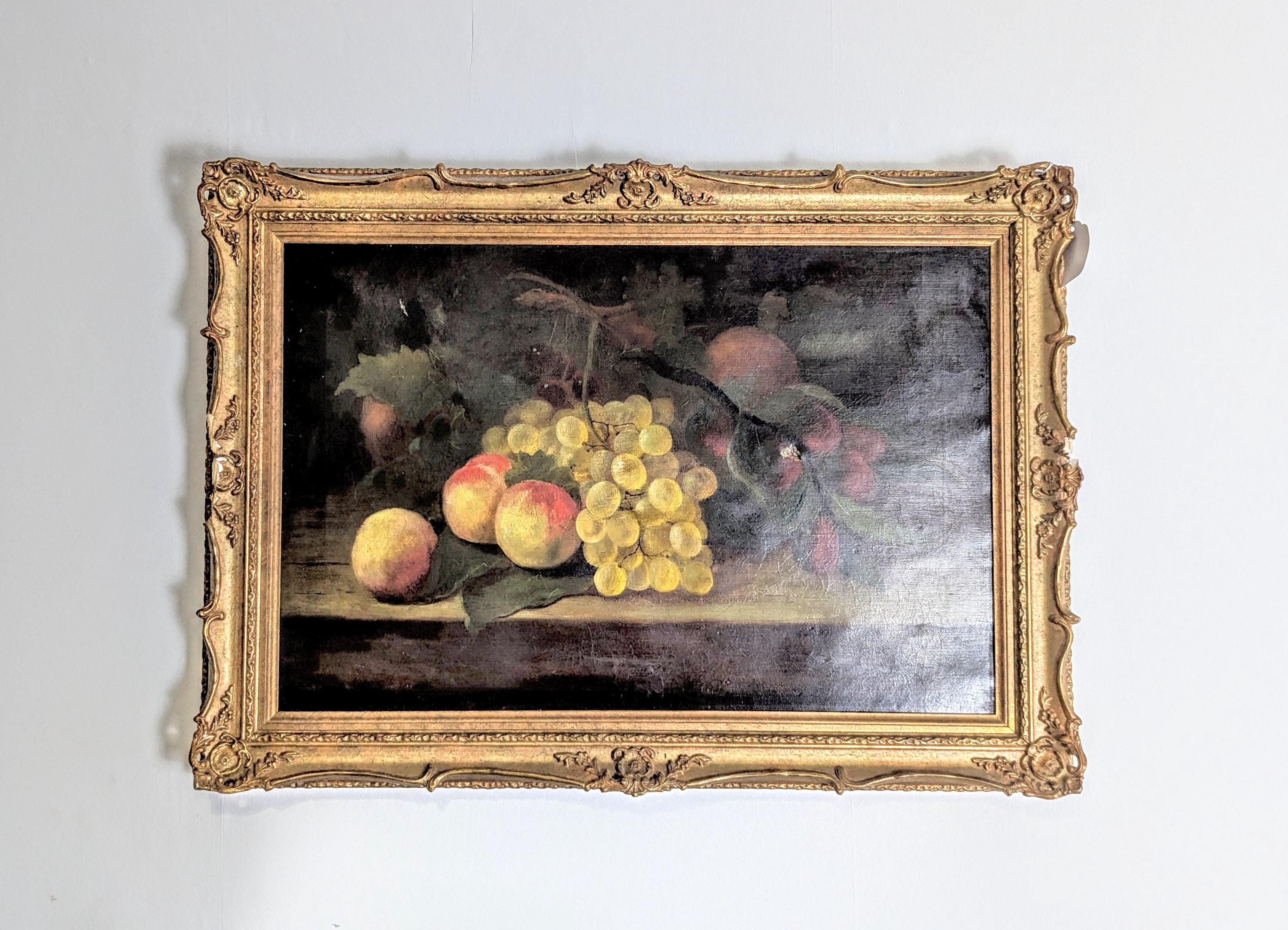 This is an English piece painted in the 19th century and features a selection of fruits and a bowl on a dark ground with realistic highlights and shadows.