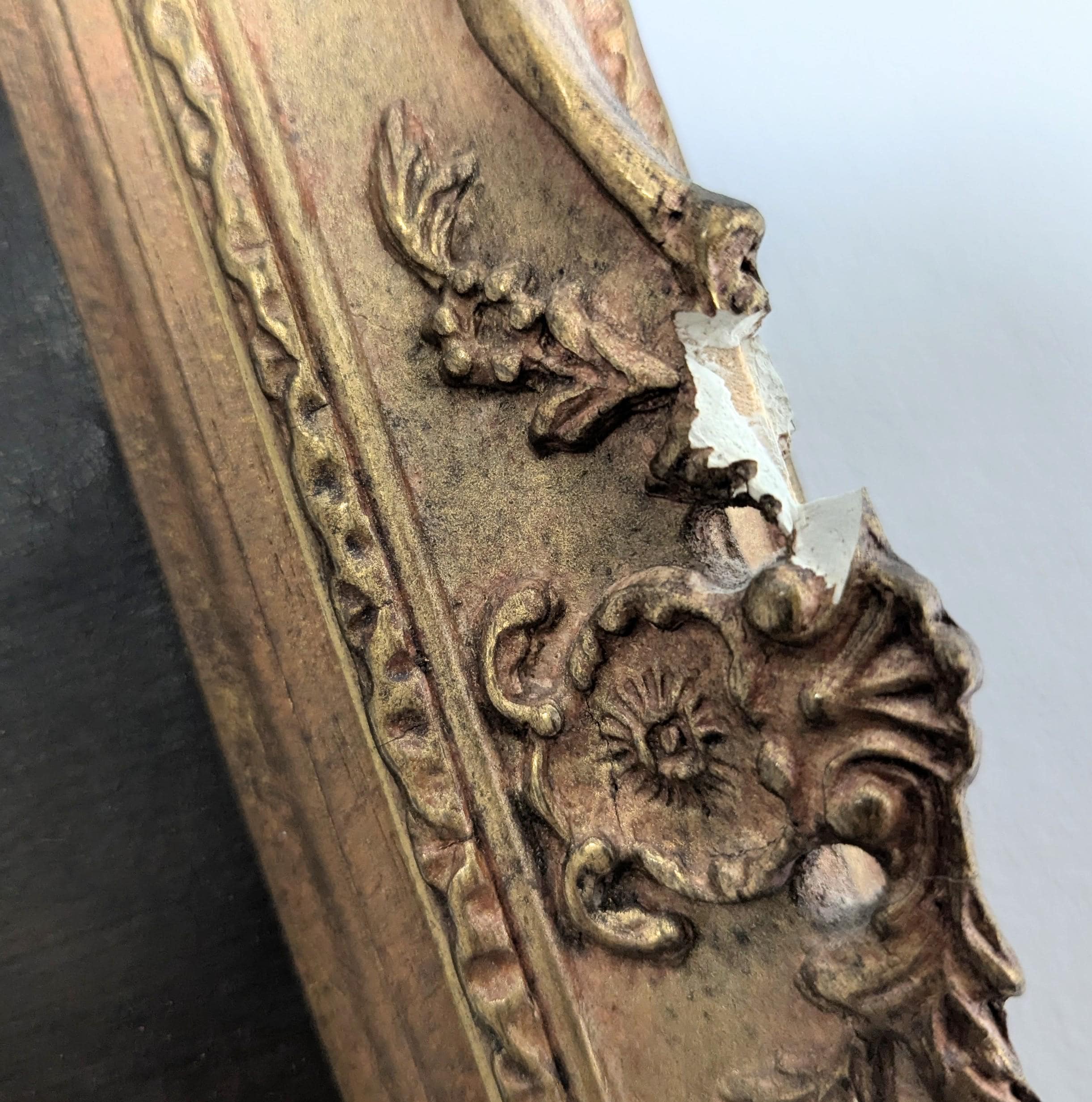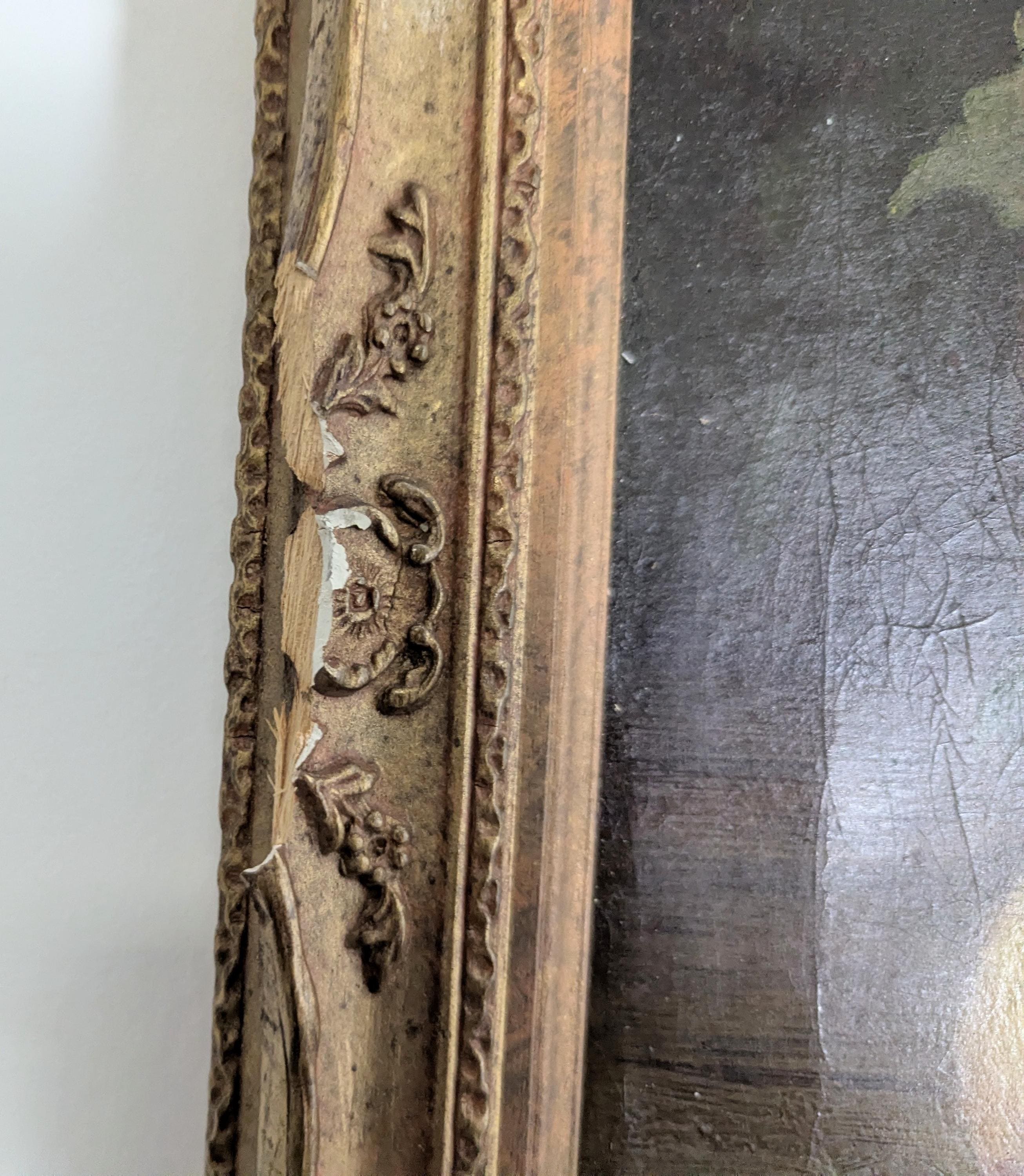 It is an oil on board, framed in what appears to be the original frame, a very grand gilt frame with composite moldings and a wooden frame.
