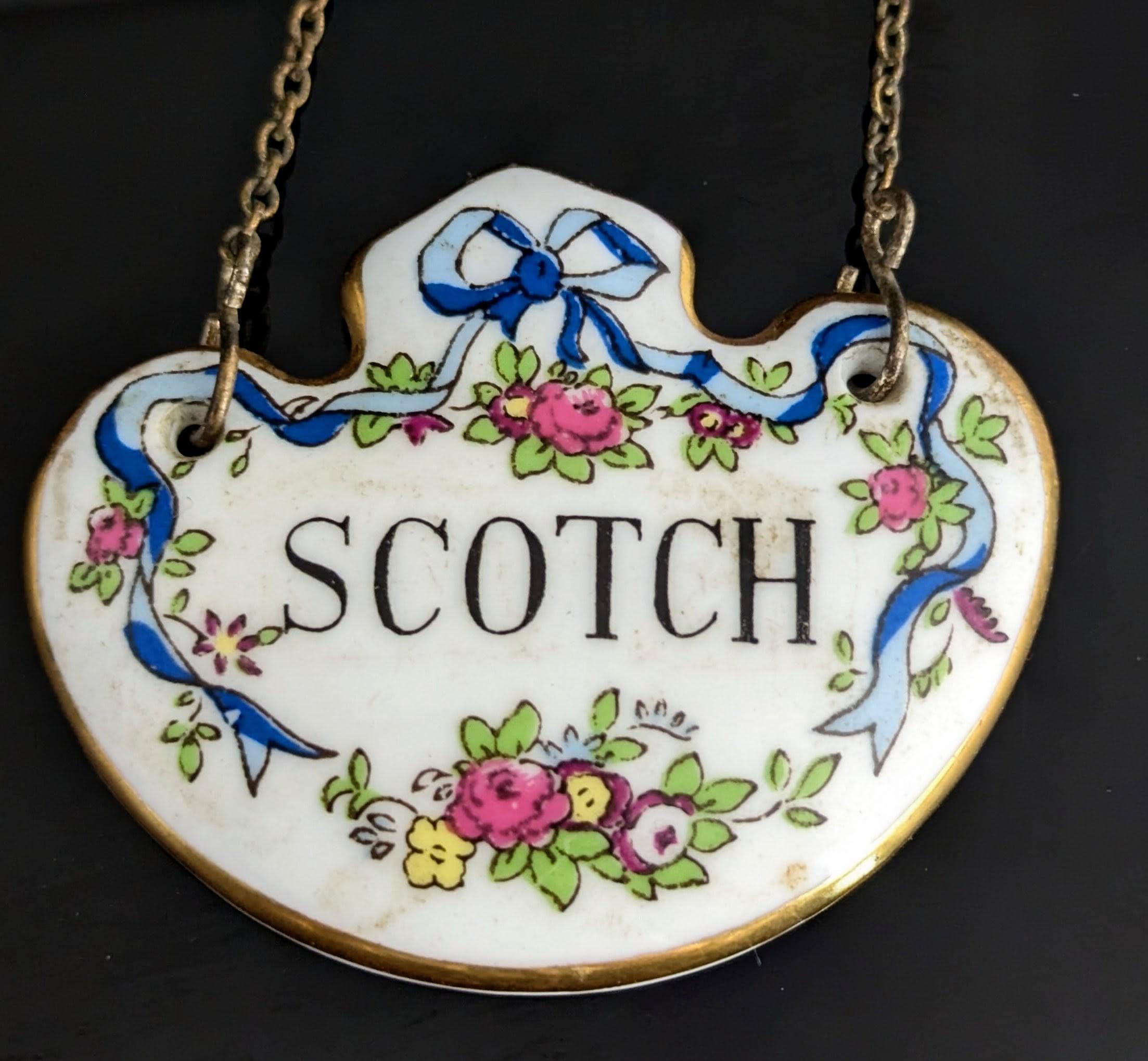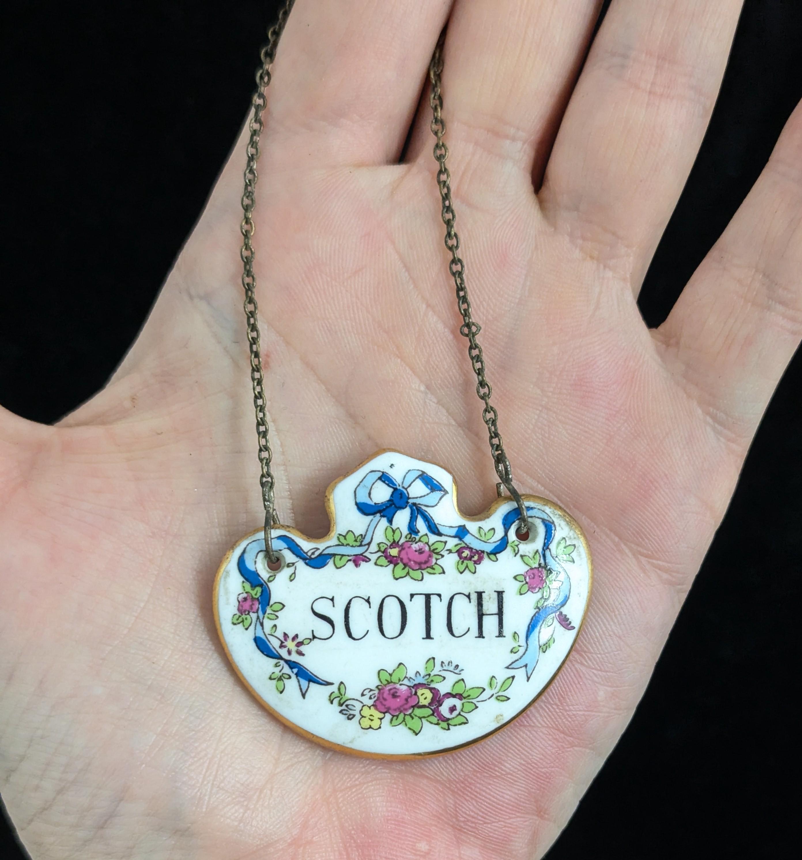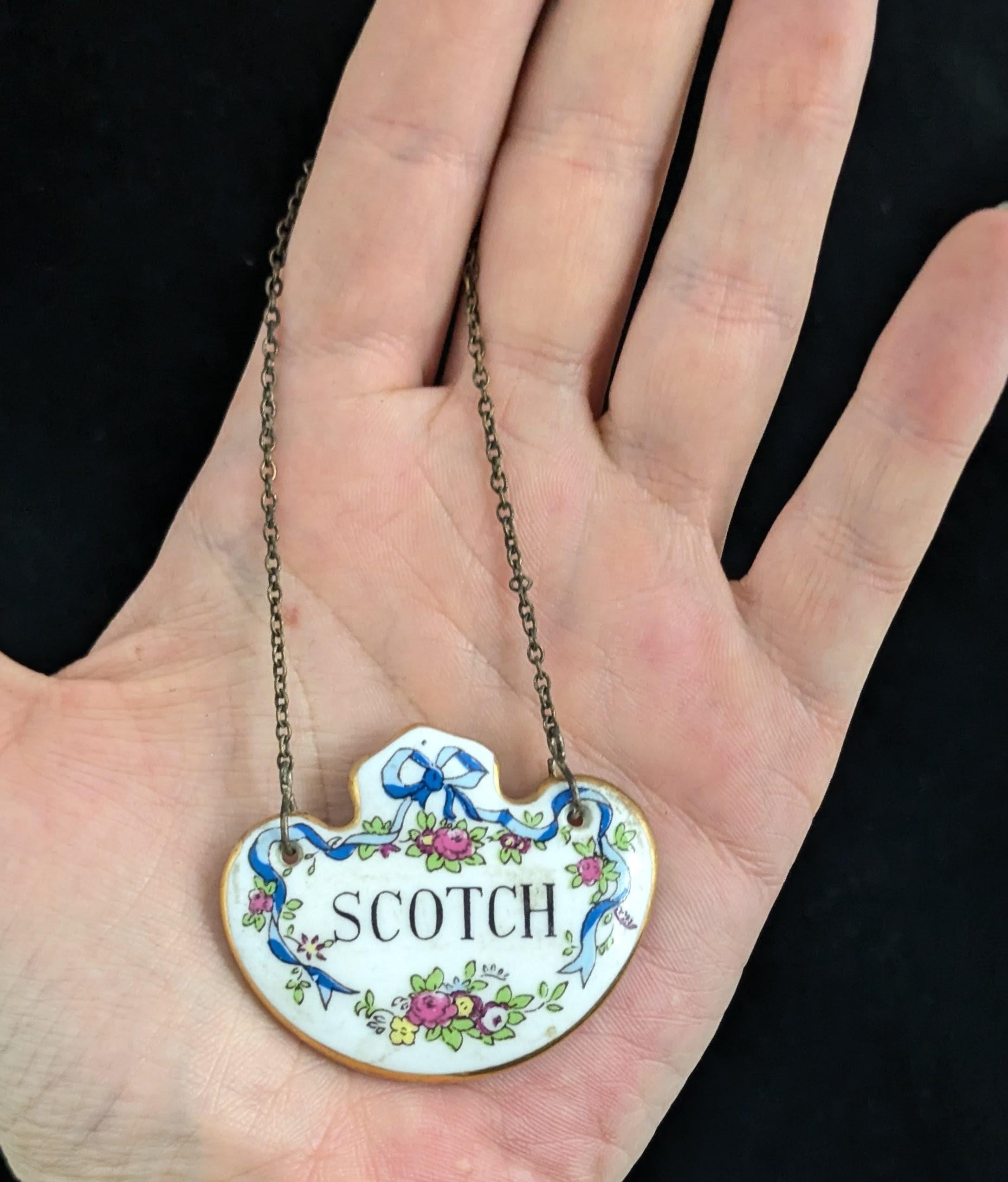 Made from ceramic, front glazed with a ribbon swag design and text that reads Scotch, marked on the reverse for Staffordshire potteries, crown, fine bone china, green back stamp c1920s / 30s