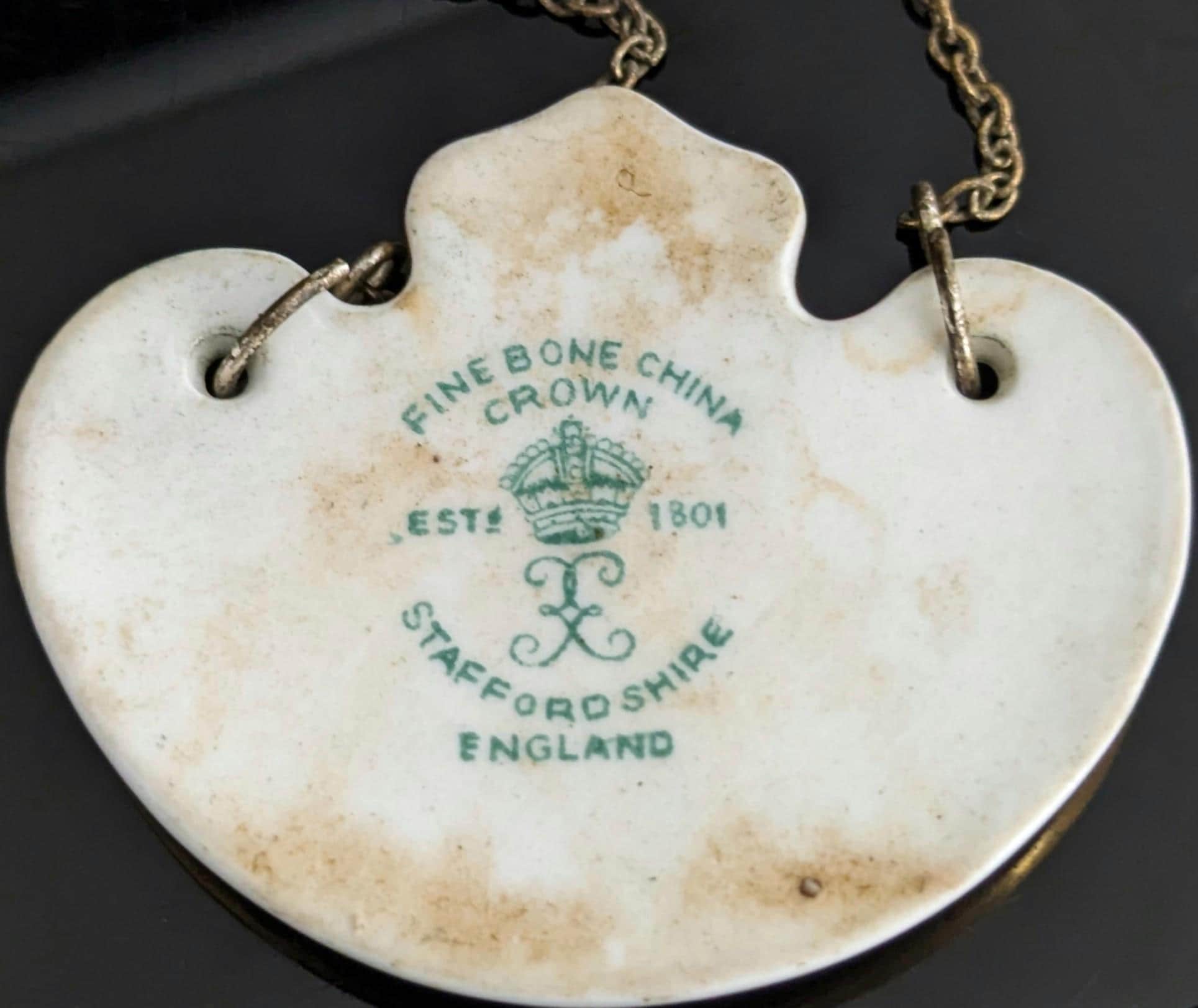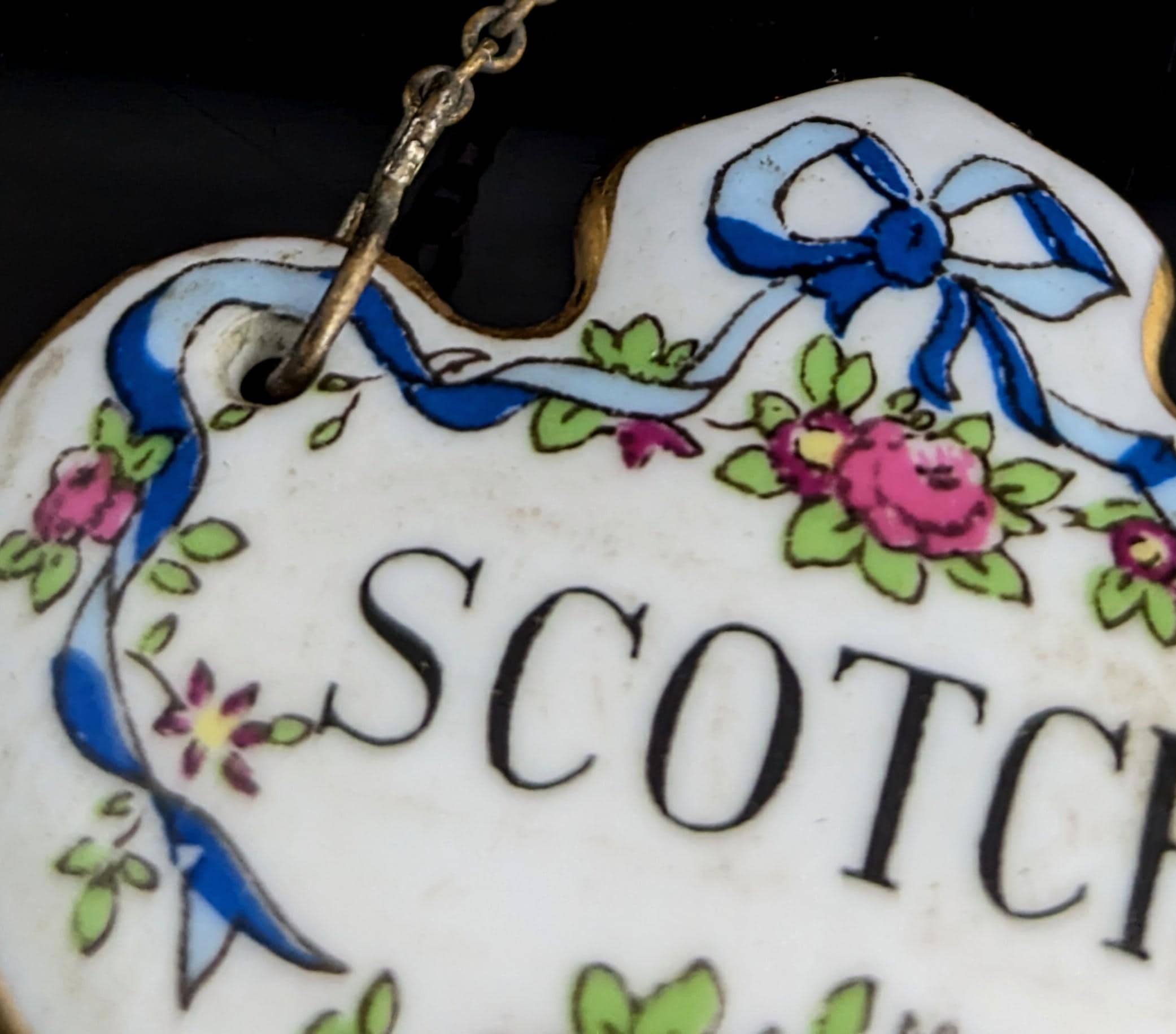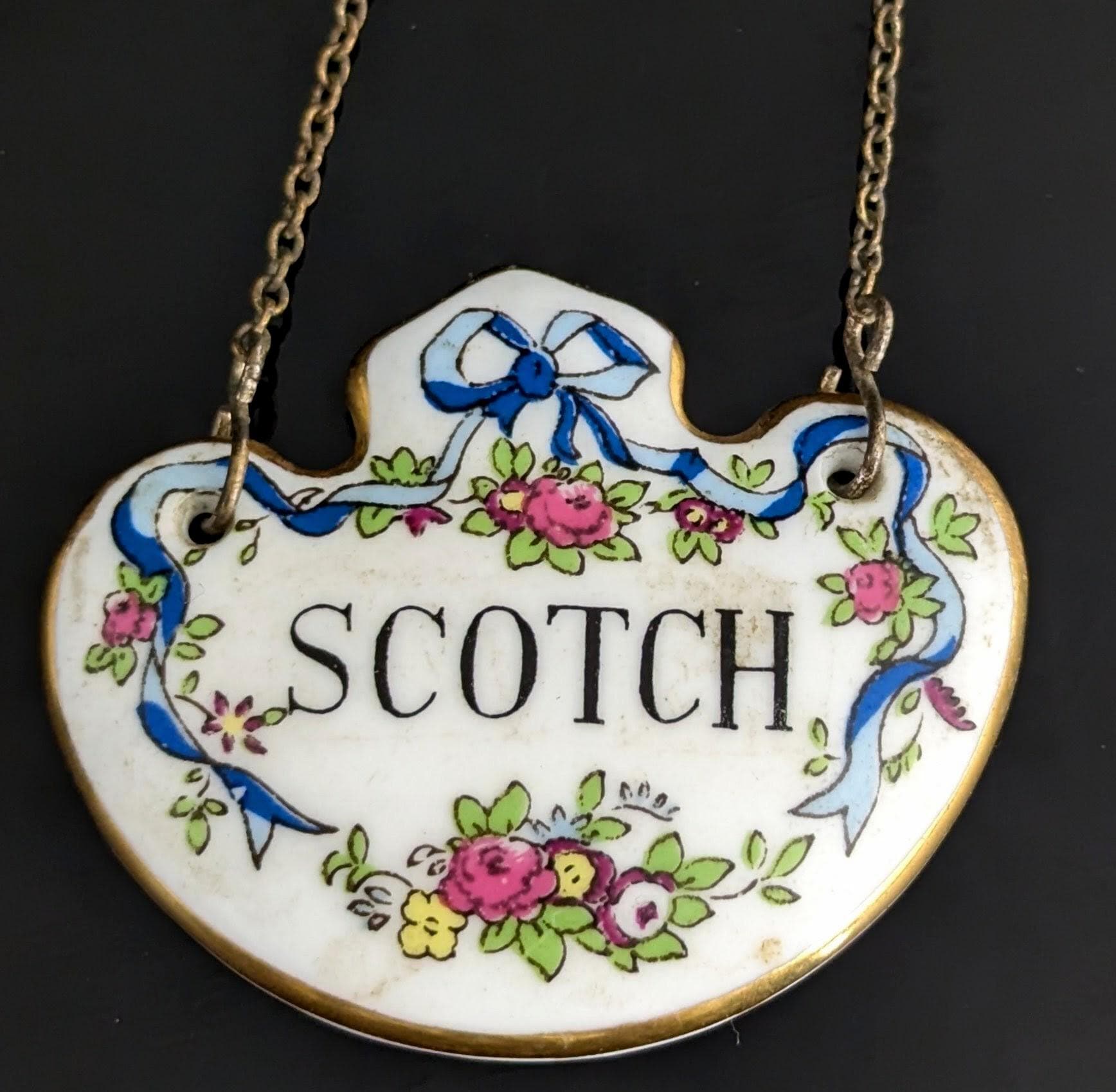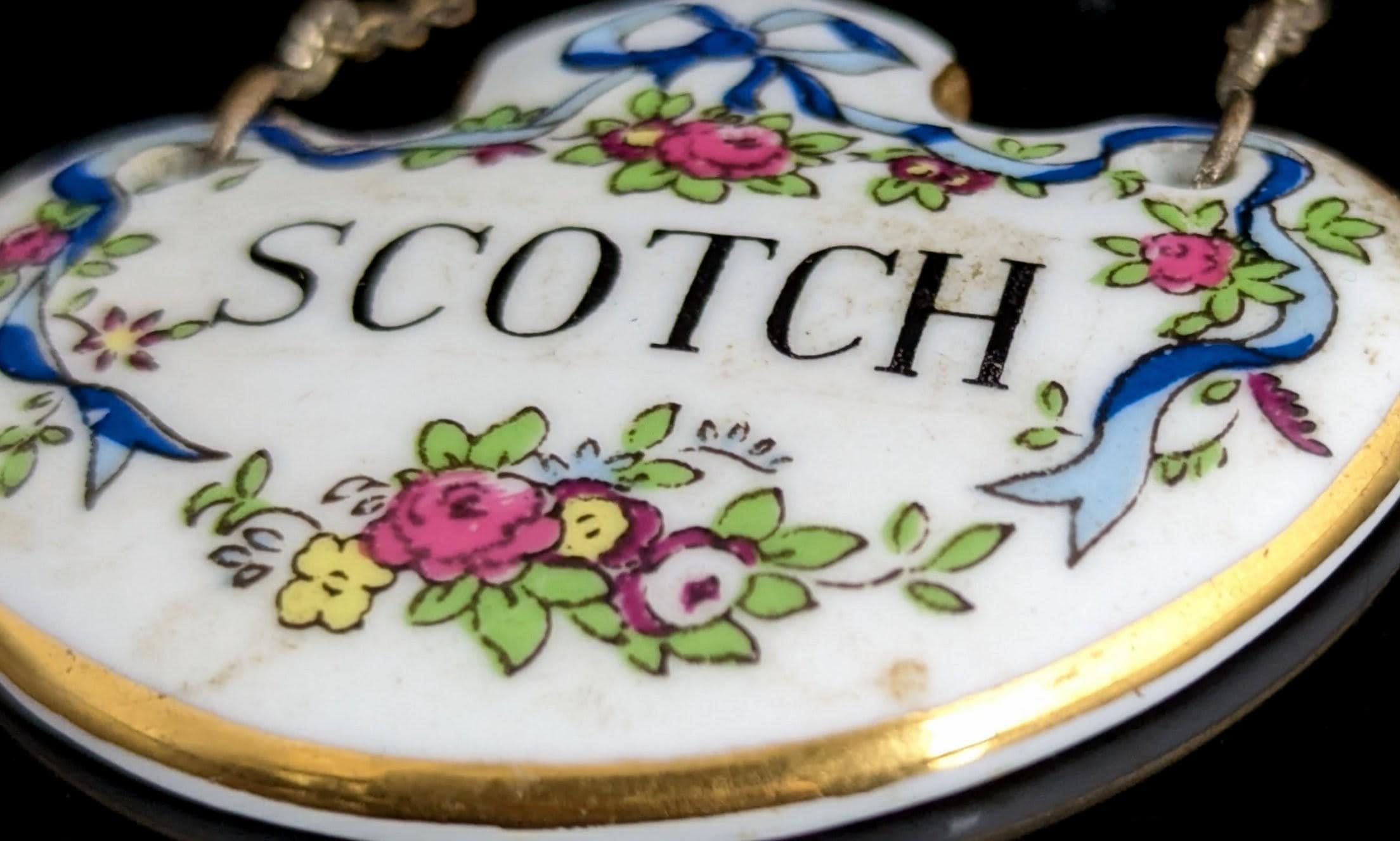 Made from ceramic, front glazed with a ribbon swag design and text that reads Scotch, marked on the reverse for Staffordshire potteries, crown, fine bone china, green back stamp c1920s / 30s