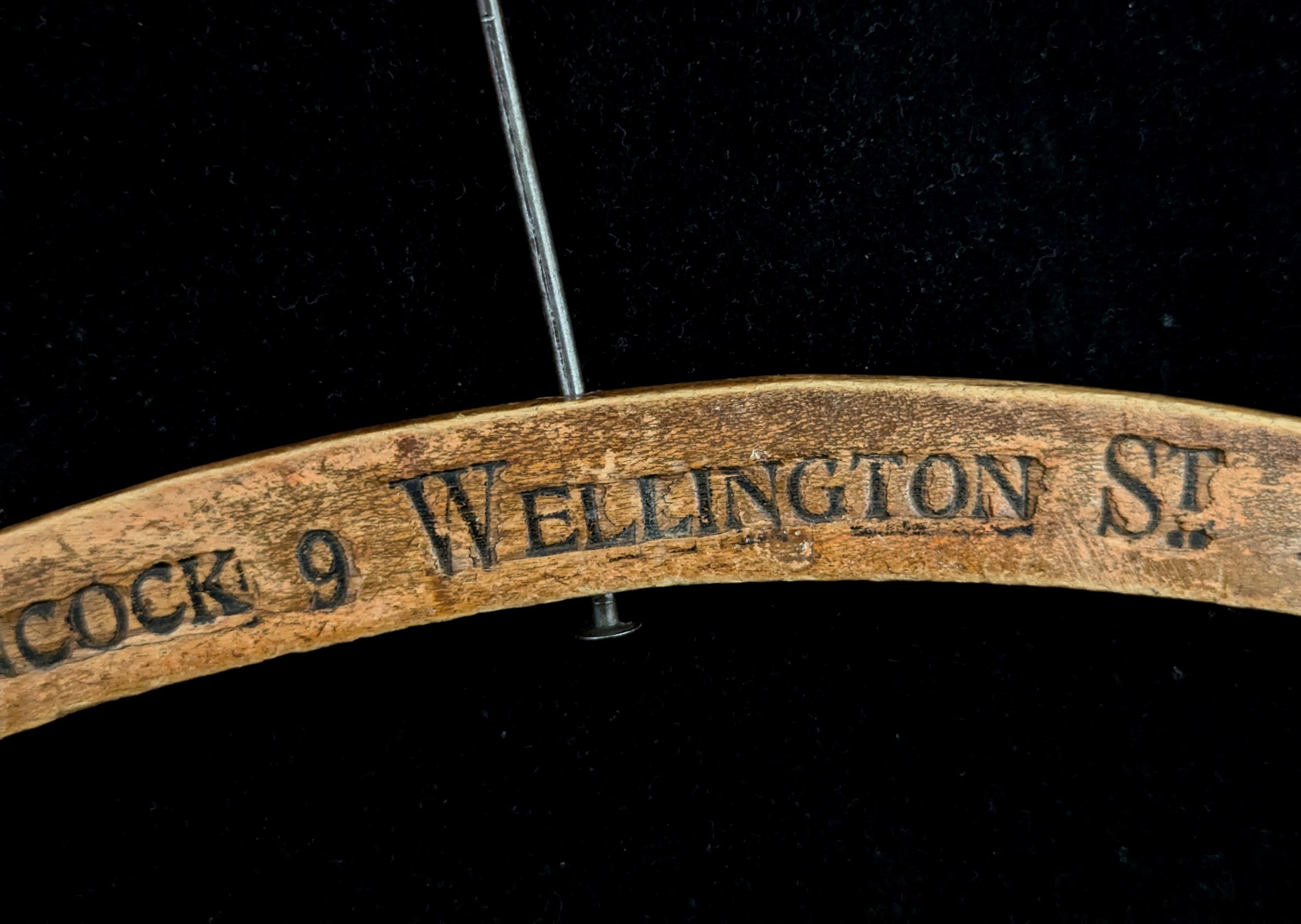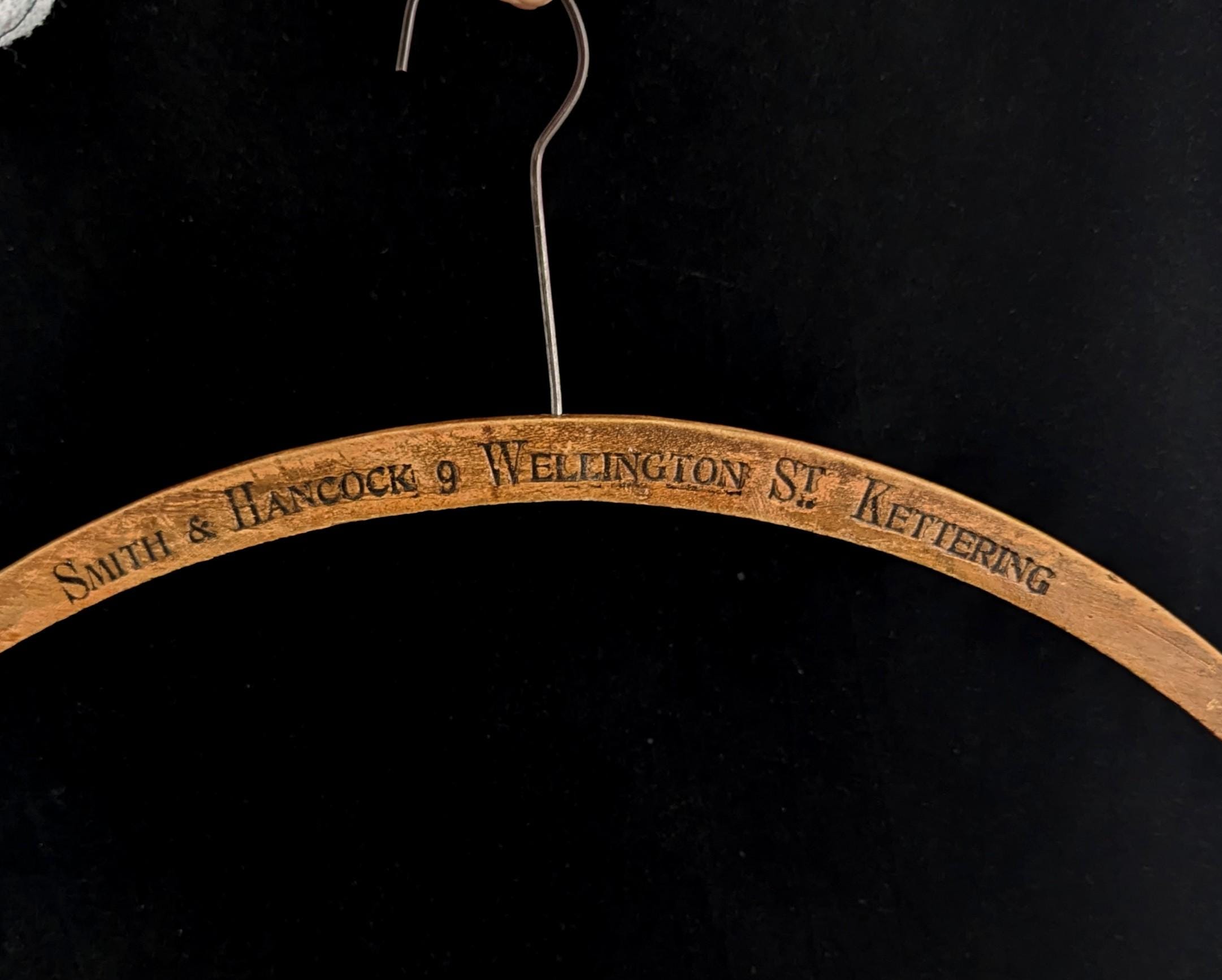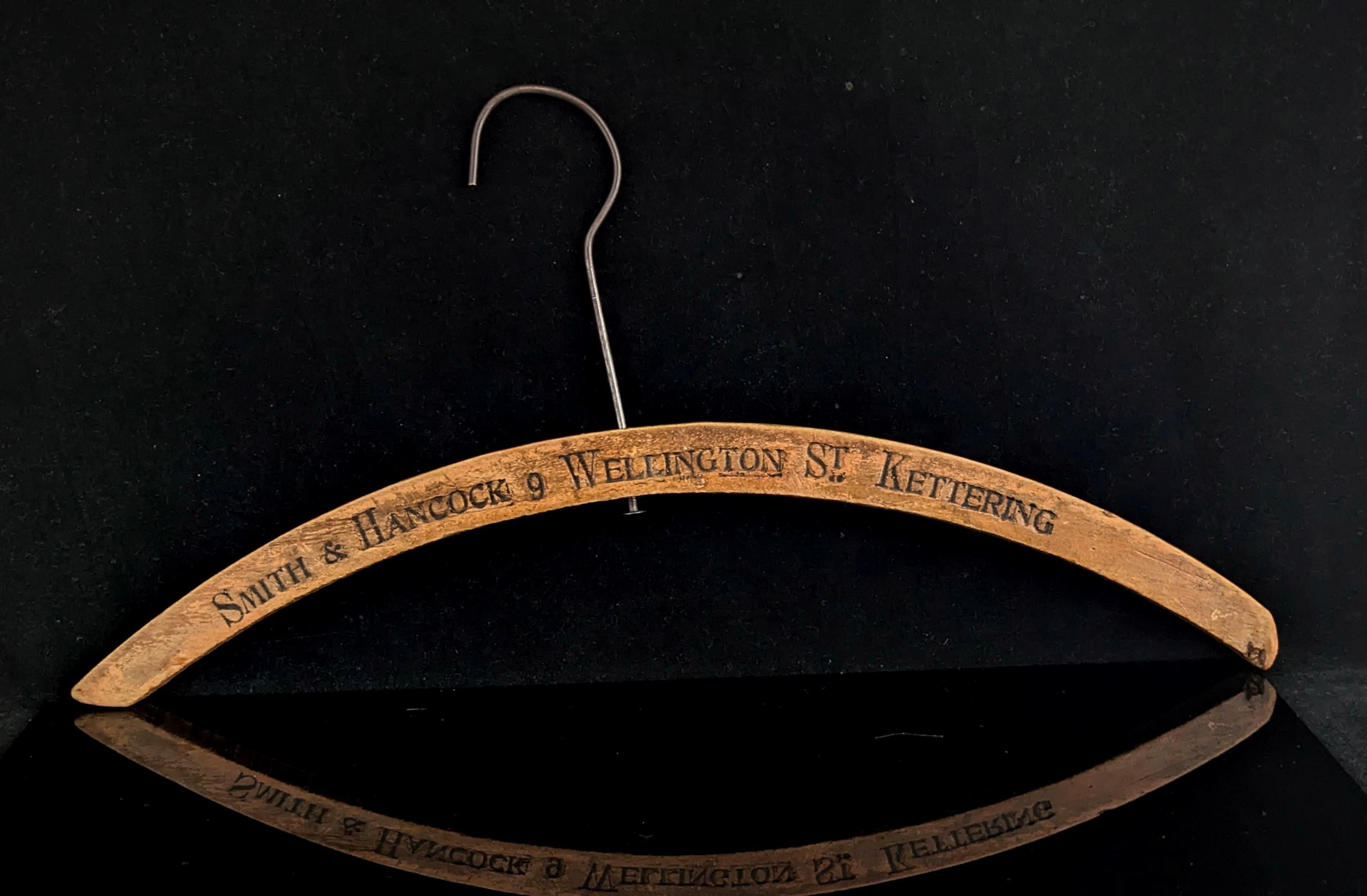 Made from wood it has a carved out text to the front reading; Smith and Hancock, 9 Wellington St Kettering, the text is dark and the hanger has a metal hook.