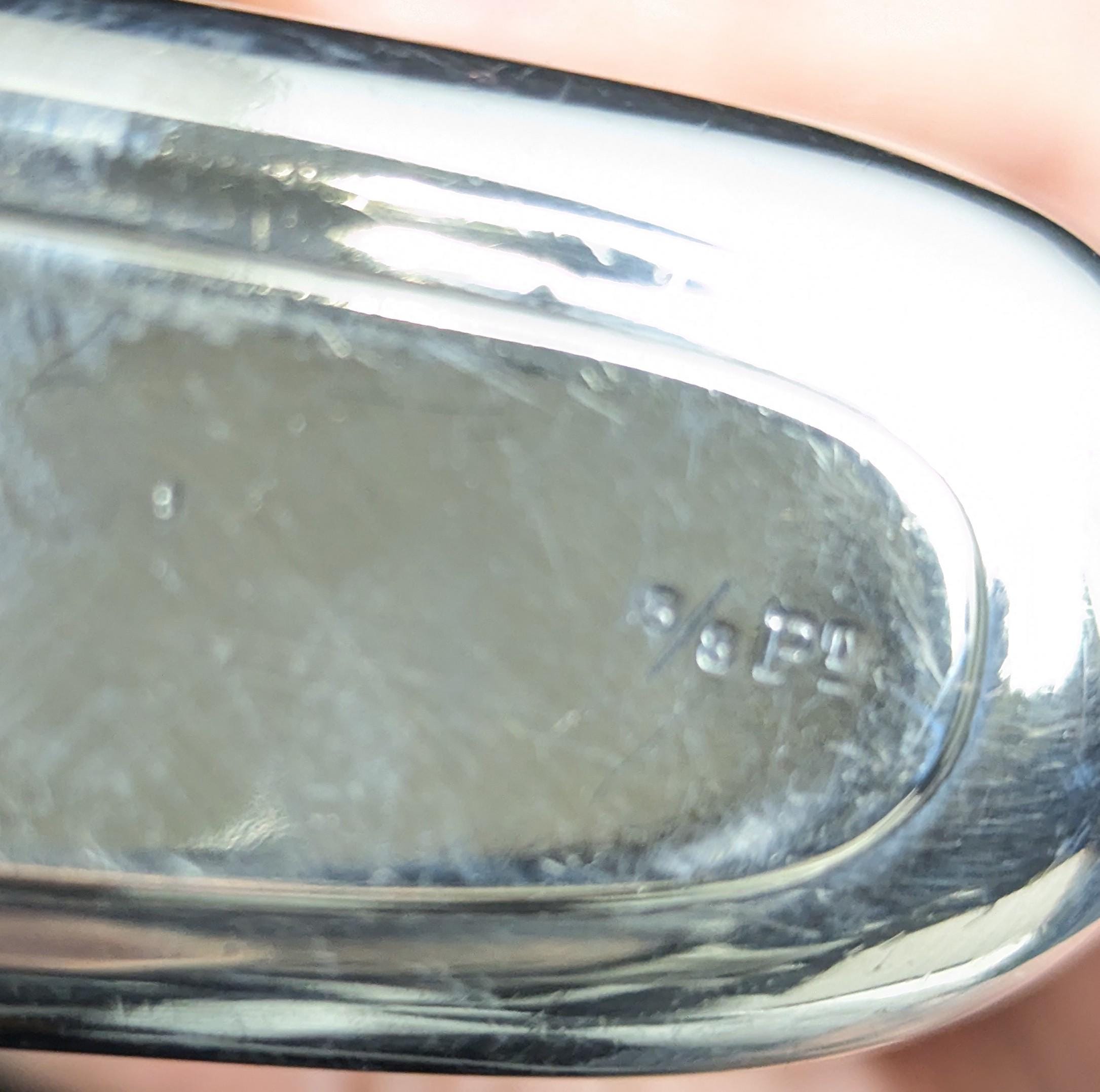 This hip flask is fully hallmarked for sterling silver, Sheffield assay office, 1935, James Dixon and Sons, a renowned silver maker.