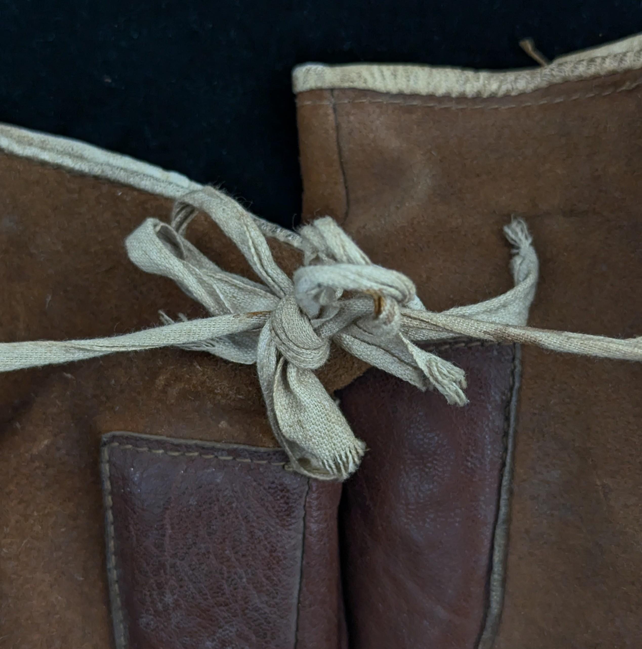 Made from supple brown leather with hand stitching they have the original cream cotton ties which adds a lovely touch.