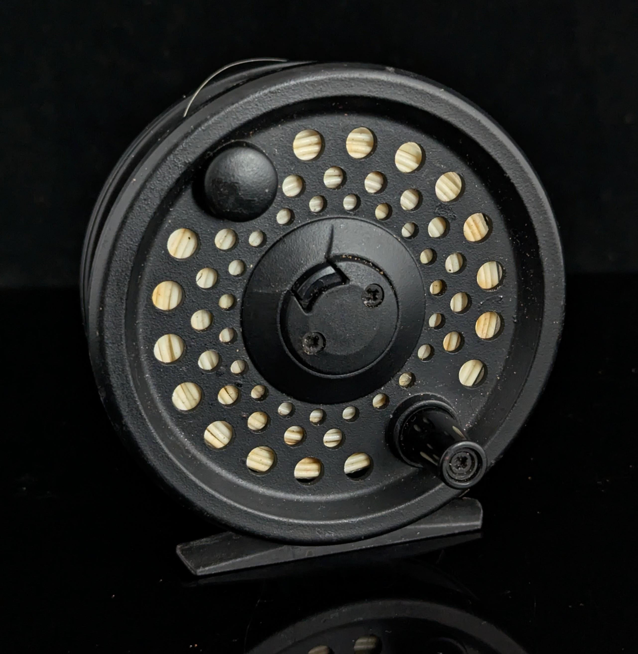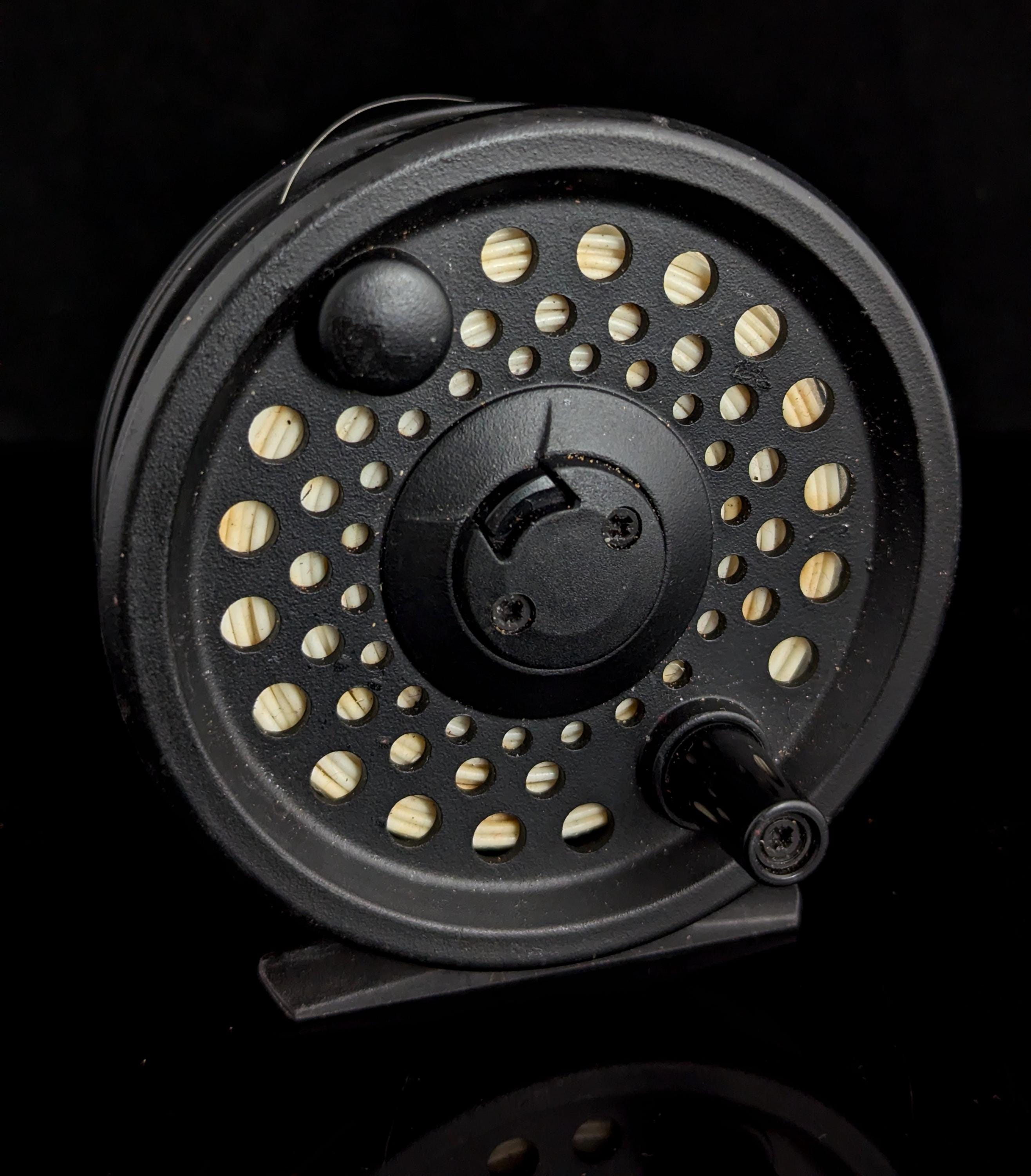 A fly fishing reel it is made from a graphite composite with plastic handles.