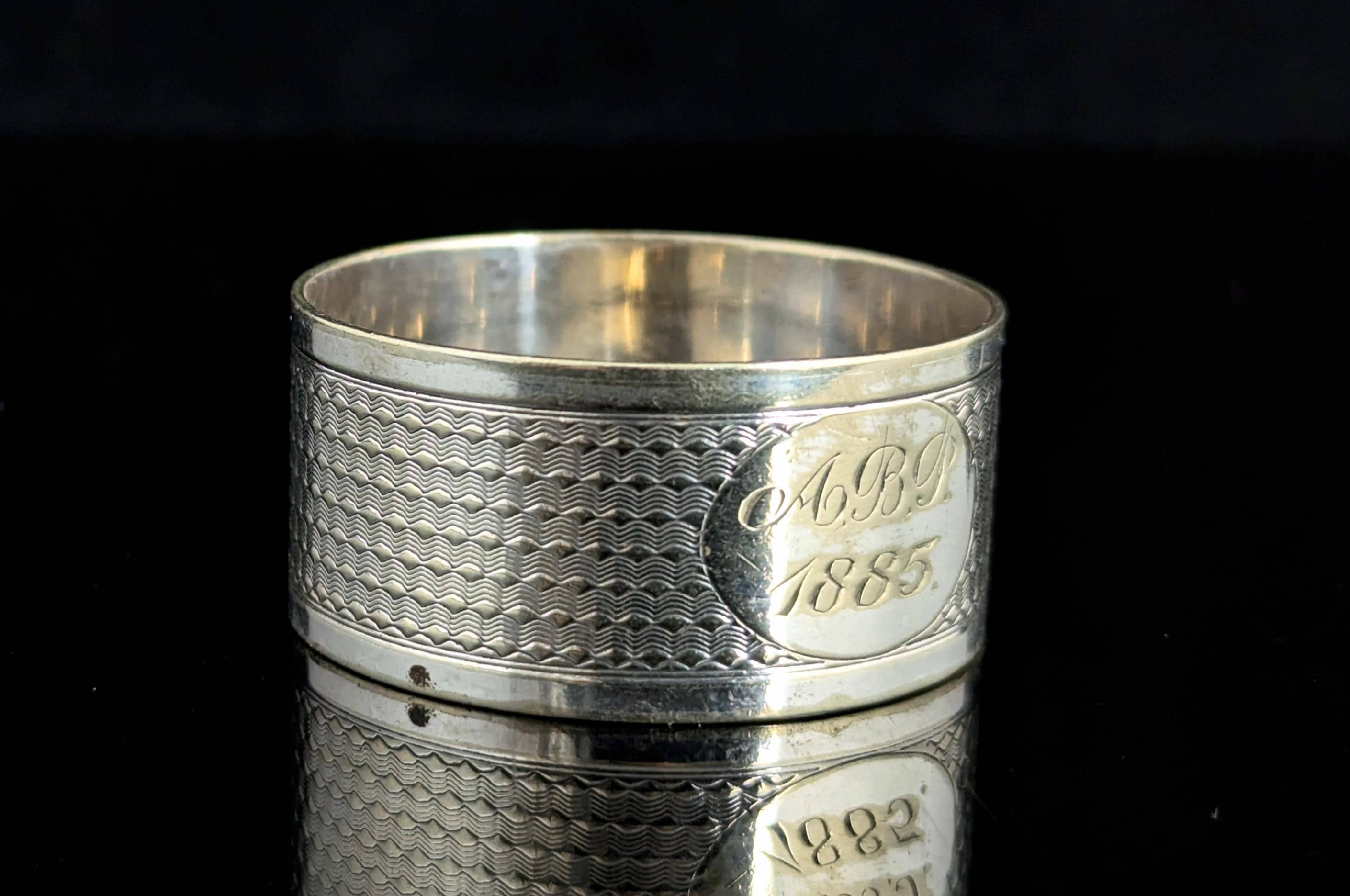 The body is a round cylindrical shape with an engraved engine turned design, it has a central plain oval cartouche which has a monogram engraved; ABP 1885, in fancy script.