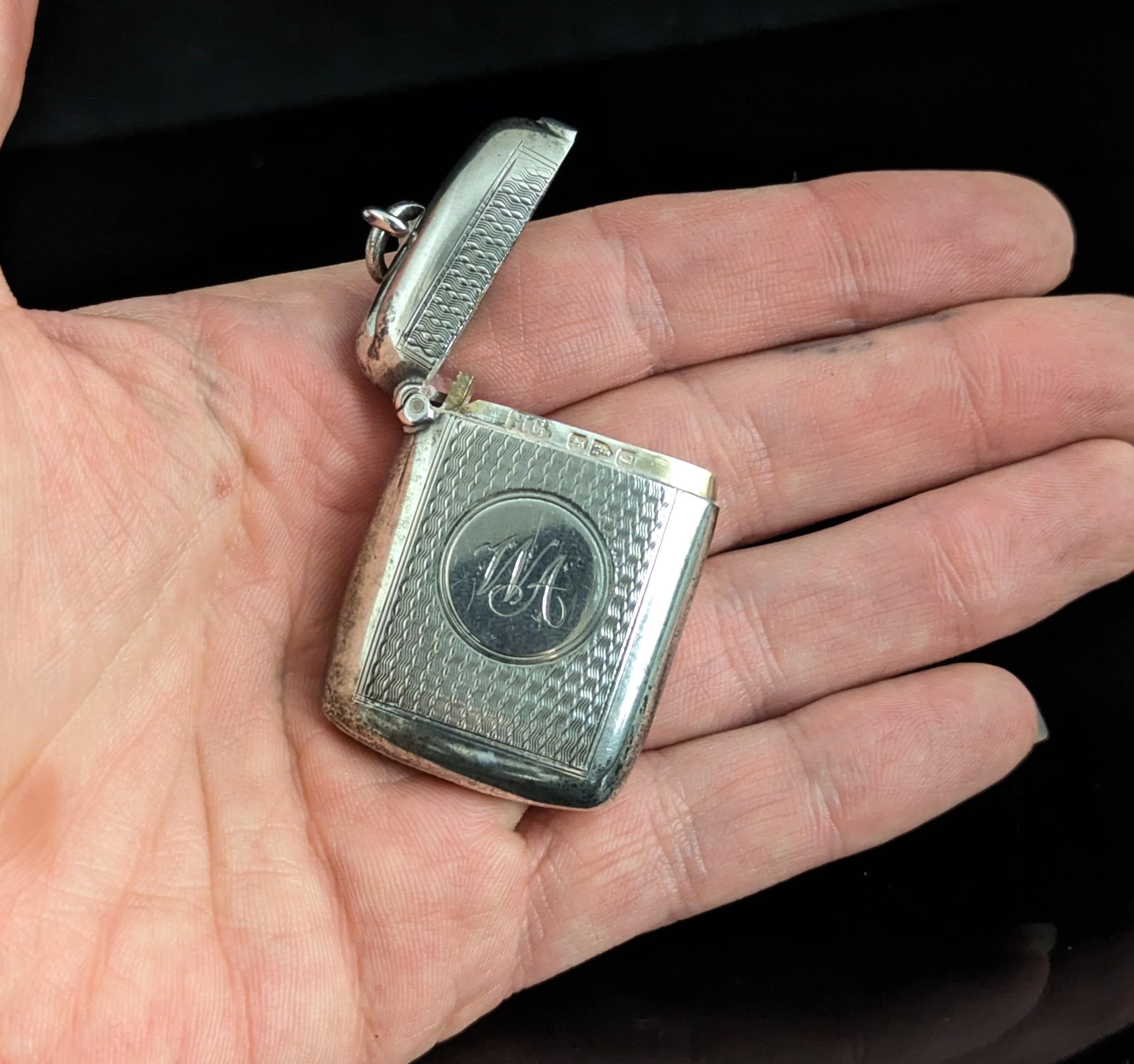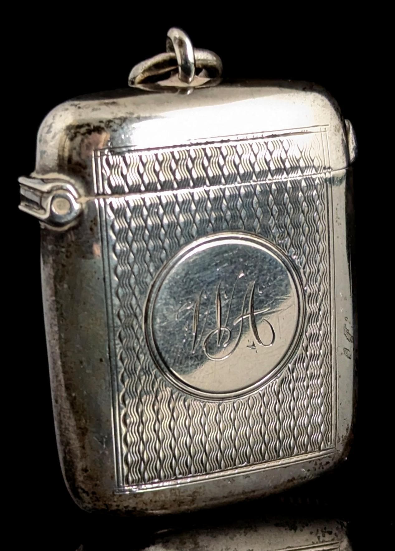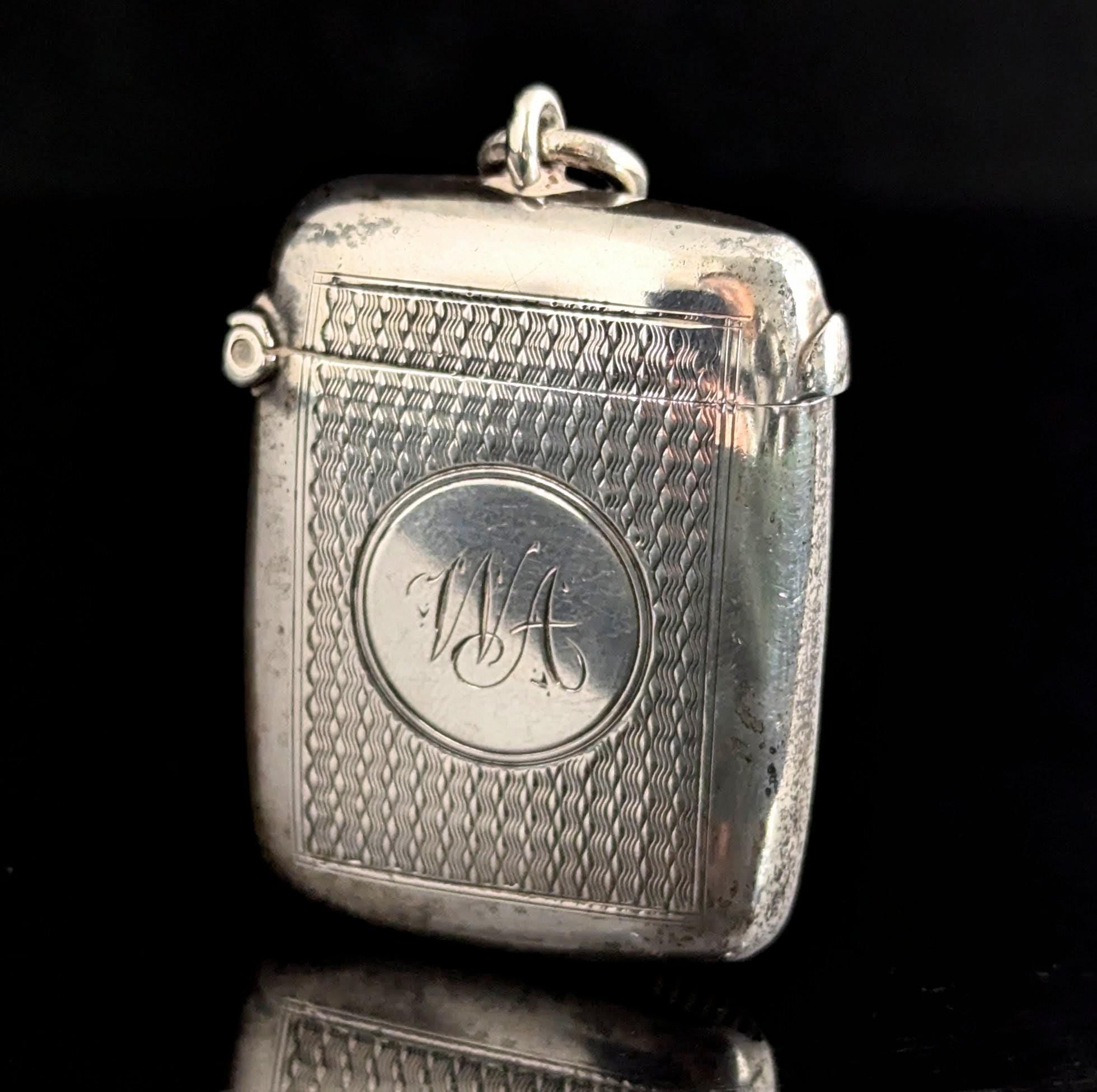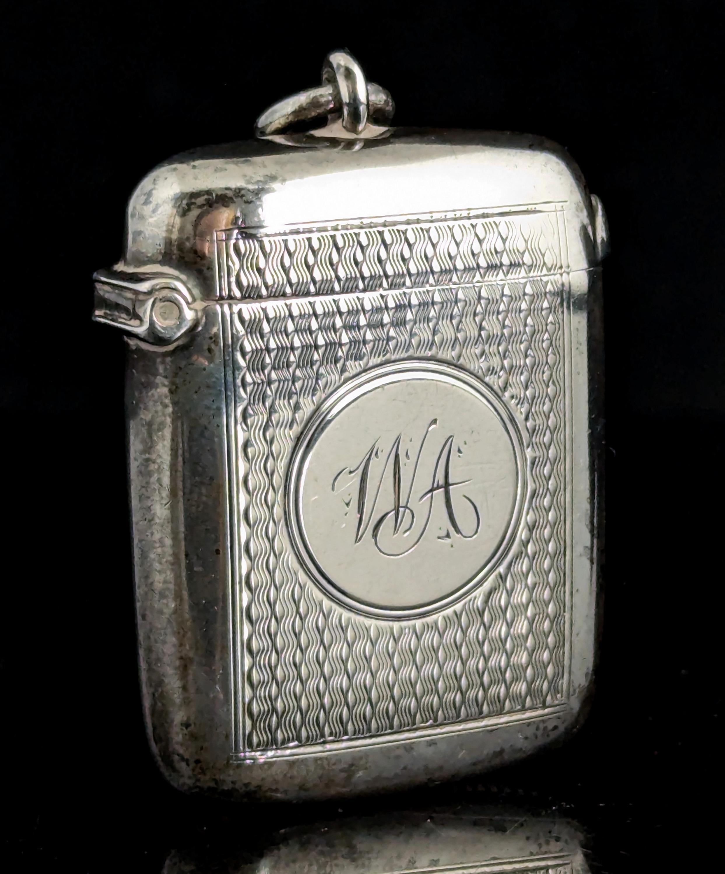 This match safe is engraved with an attractive, allover, wavy engine turned design and has a monogram engraved to the front with the initials WA.