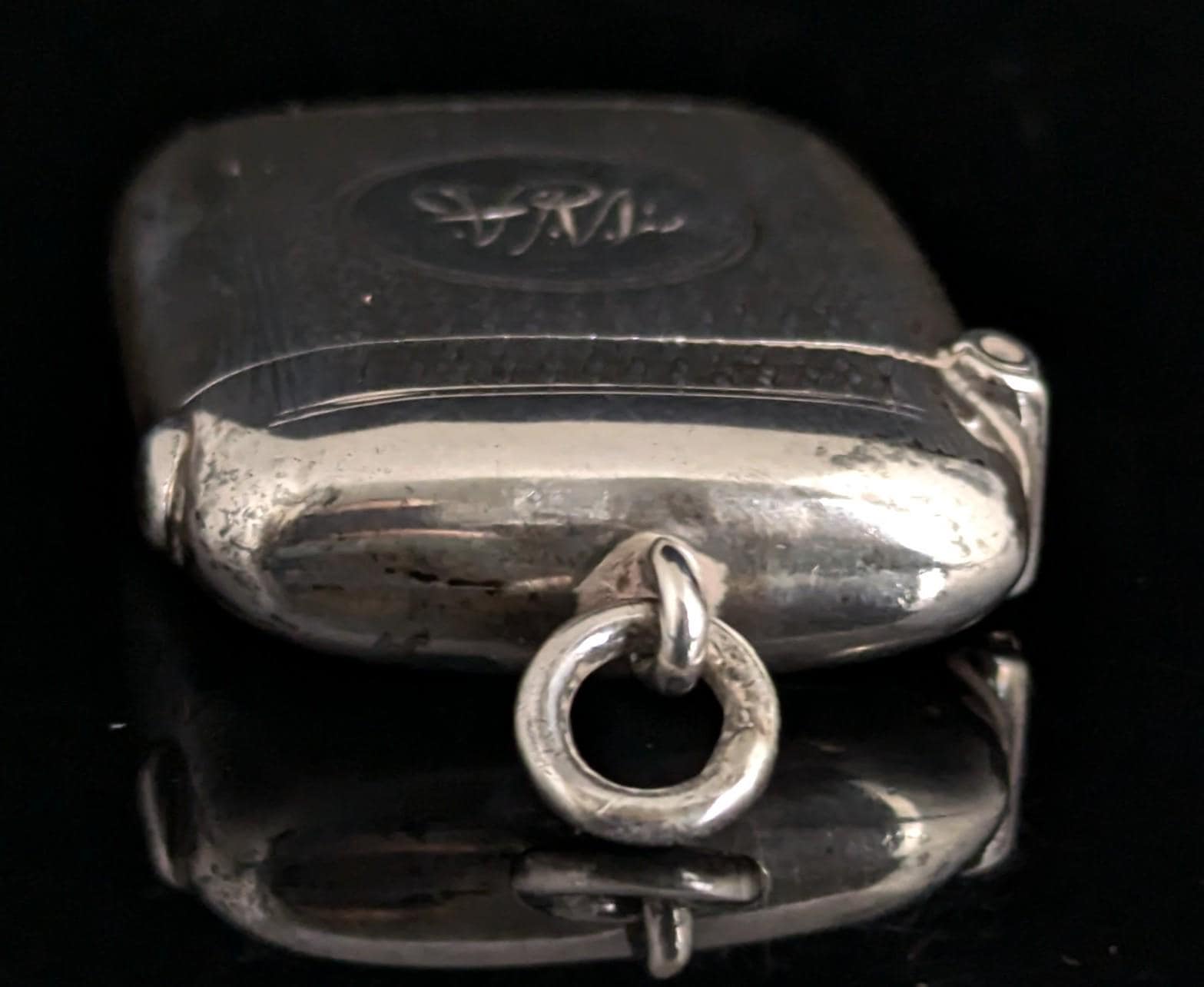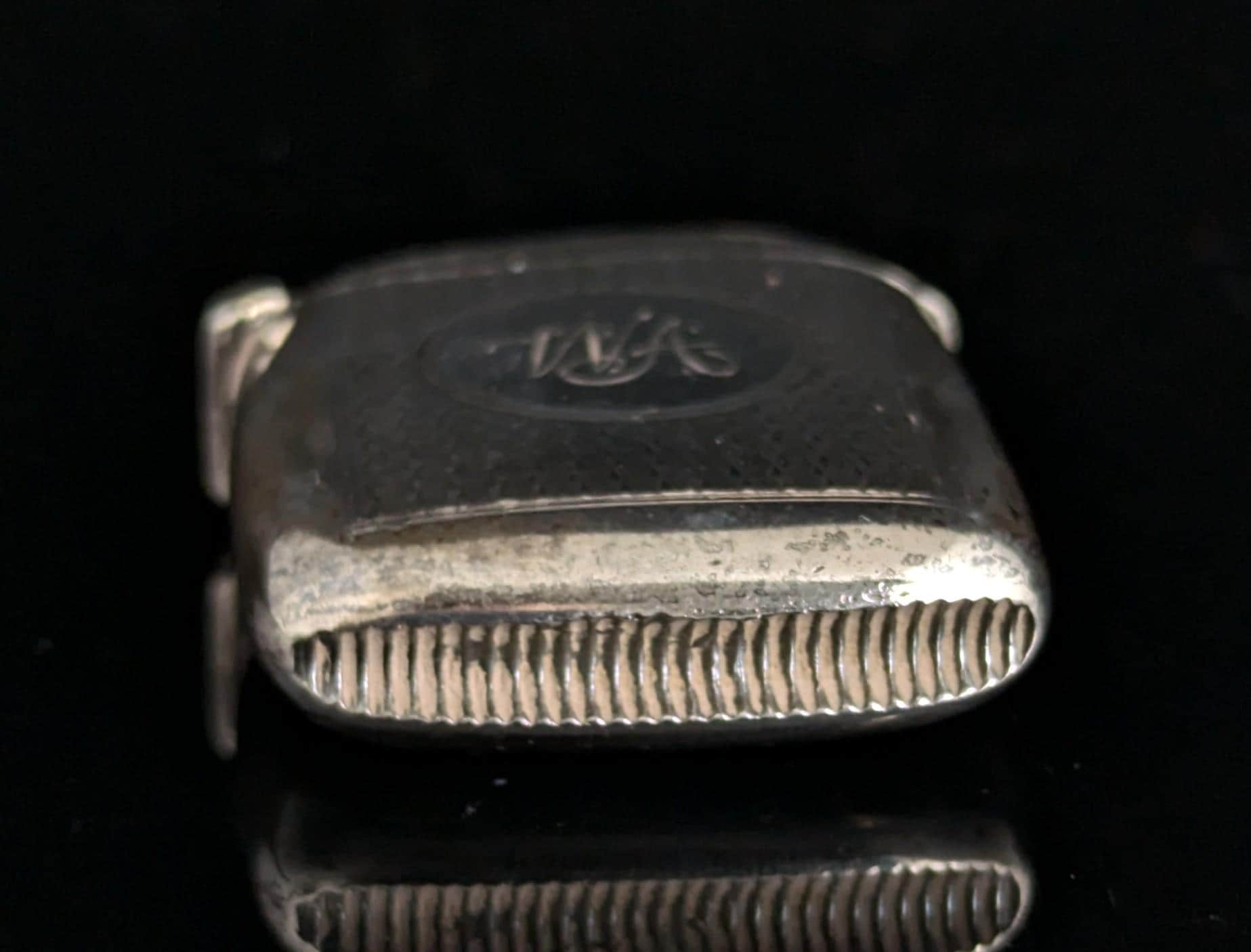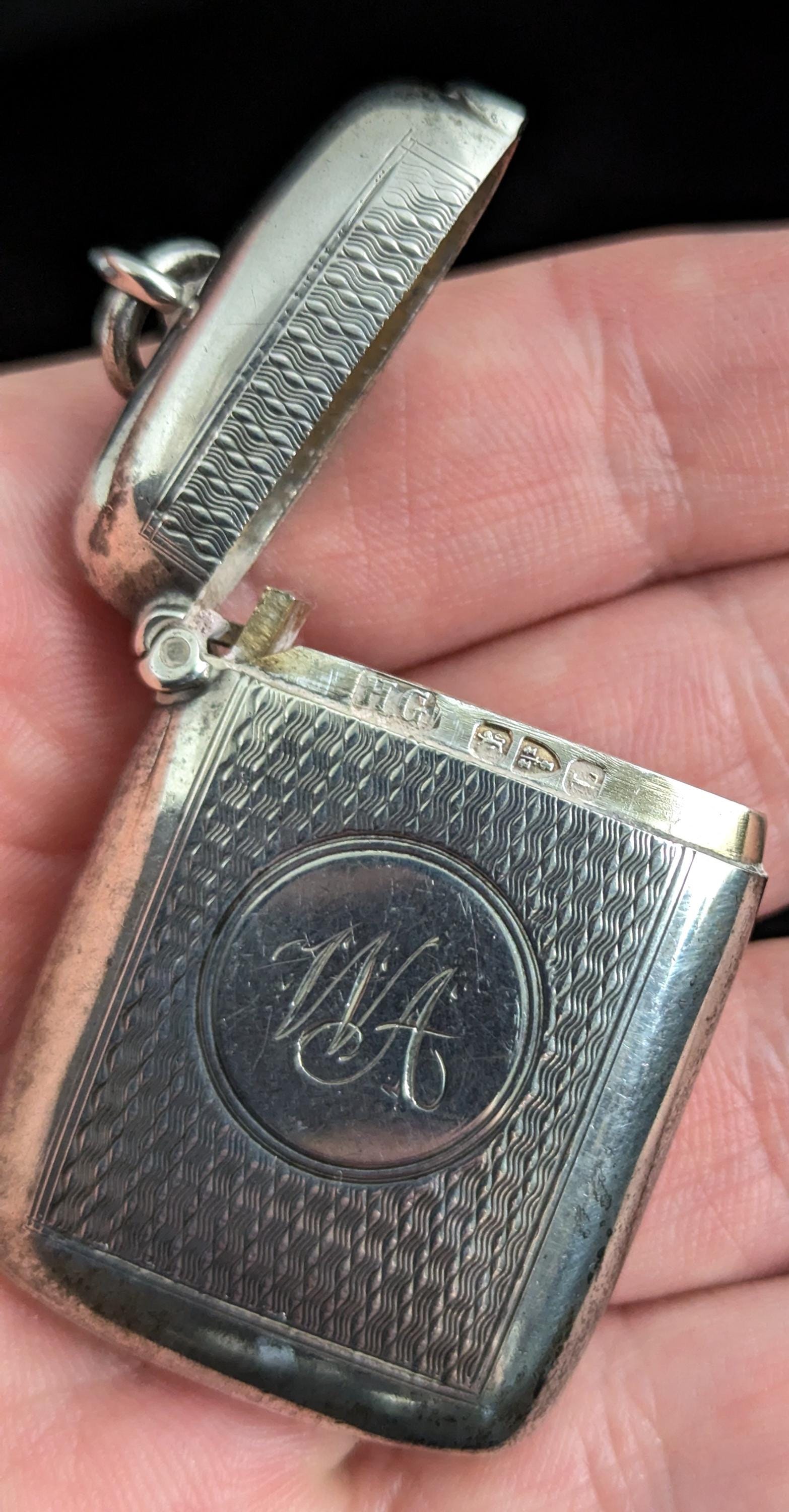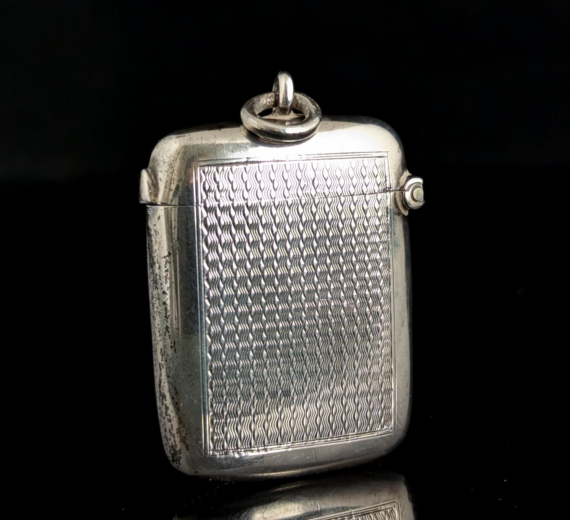 This match safe is engraved with an attractive, allover, wavy engine turned design and has a monogram engraved to the front with the initials WA.
