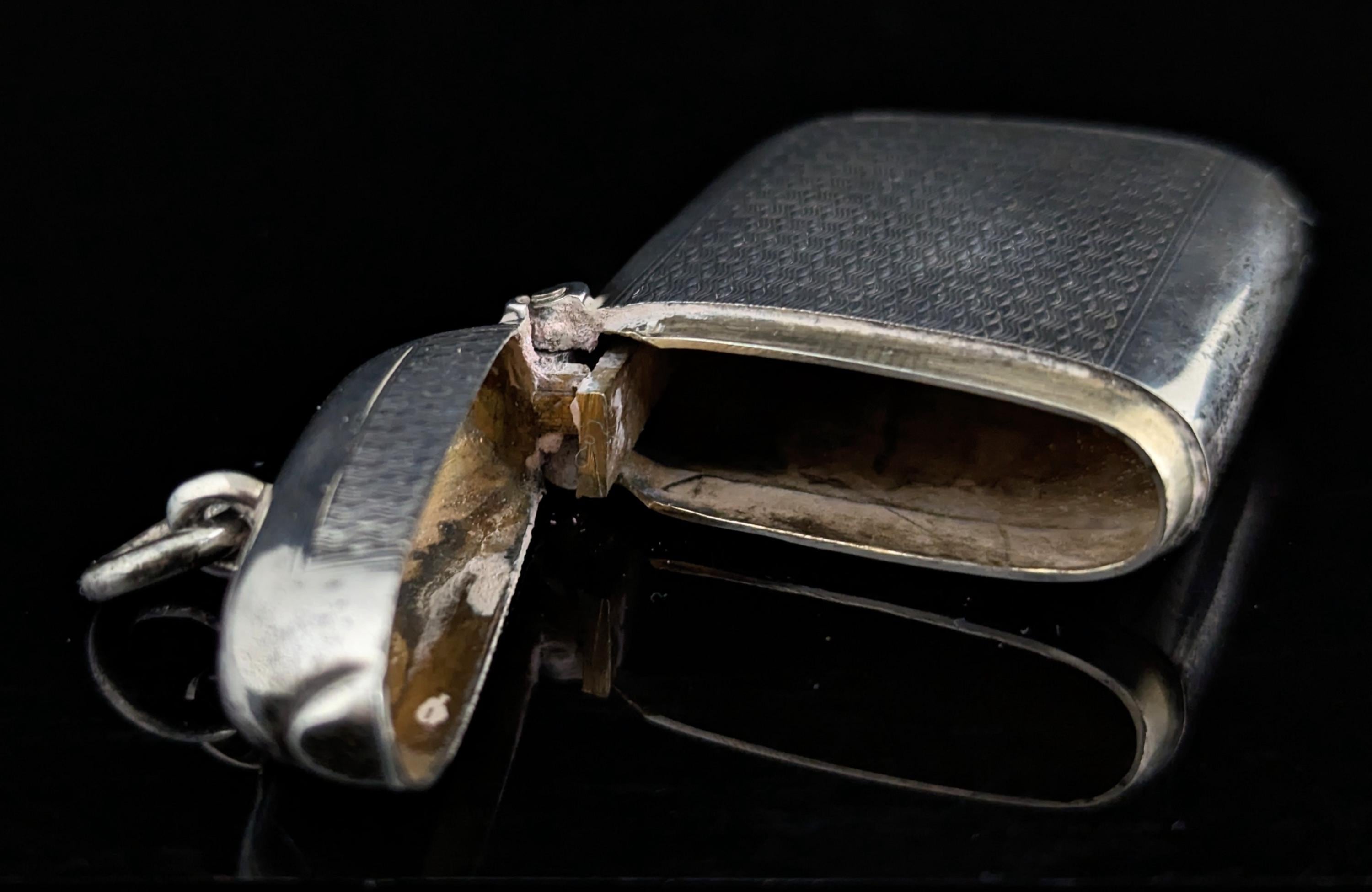 A good solid piece, made from sterling silver it is designed to clip onto a gentleman's Albert chain and has a large silver jump ring attached for such, used to store essential matches away from the elements in style and provide an essential striking base.